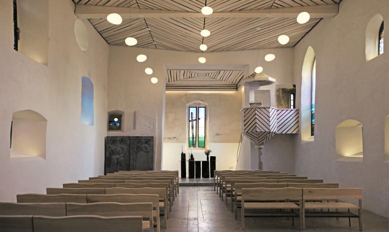 > Licht und Beleuchtung runden mit Hängeleuchten im Kirchenschi und indirektem Licht für die Fenster sowie Kapelle und Altarraum das Raumgefüge ab.