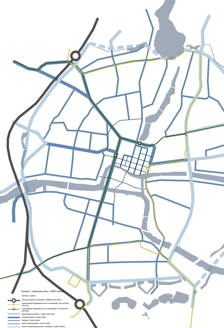 INFRASTRUCTURE – Moscow and Lenin Prospekt are prim elements of development in the new concept, too. The main difference to today's traffic solution consists in the removal of the Moscow Prospekt in the area of today's park in the southern part of „Altstadt“. The newly emerging roads are based on the historical course and are linked on three sides by a kind of a clasp to the primary network. So the whole area is connected to this system by the north-south-axes like a harp. The crossing pedestrian connections are basically passable for special vehicles of the fire brigade, the medical care and the waste disposal. An advantage of this urban planning concept is the fact that its solution is independent of ideas about demolition or preservation ofthe bridge over the Kneipphof-Island, because the bridge is not relevant for the concept. For the sake of a well-kept townscape, urban development, and also the intended traffic reduction in the central part of the city it has to be considered to remove the bridge perspectively. Therefore it will be possible to realize a building development at Kneipphof, for example according to the idea of a critical reconstruction with several historic buildings, such as the town hall, the high school and the university or with a partial development of residential buildings. With the exception of short-term parking street parking should be prohibited throughout the hole inner-city district. Parking is generally provided below ground level.