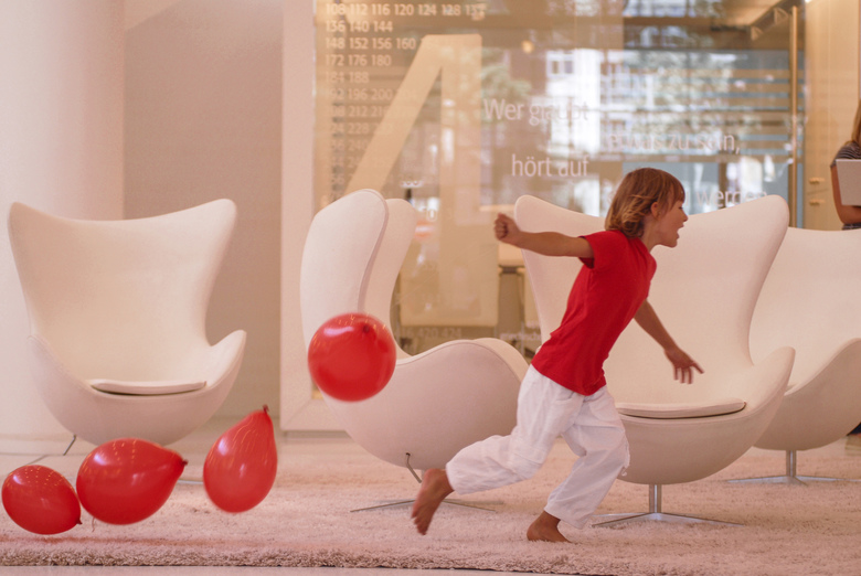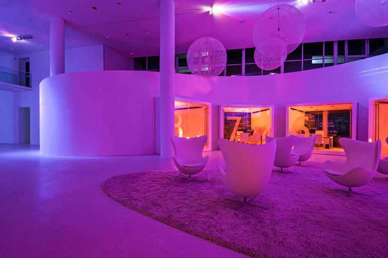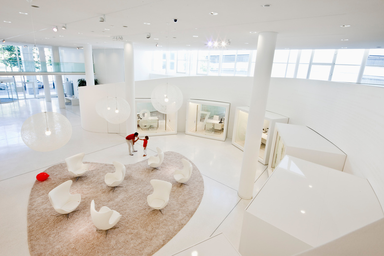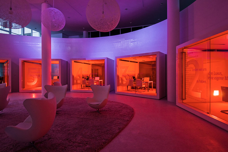 Neugestaltung der alten Eingangshalle zum repräsentativen Kundenforum. Ein dynamischer Wandschwung zentriert das Erdgeschoss zur kreisrunden Piazza.Mittendrin der Kunde, umgeben vom Empfangsbereich und transparenten Beratungskuben, im Verborgenen dahinter das BrokerCenter mit Backoffice. Die Raumstimmung in homogenen Weißtönen unterstützt mit einer klassisch anmutenden Licht – Schatten Wirkung die bewegte Linienführung.