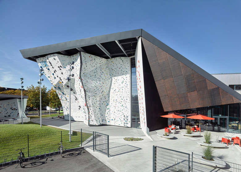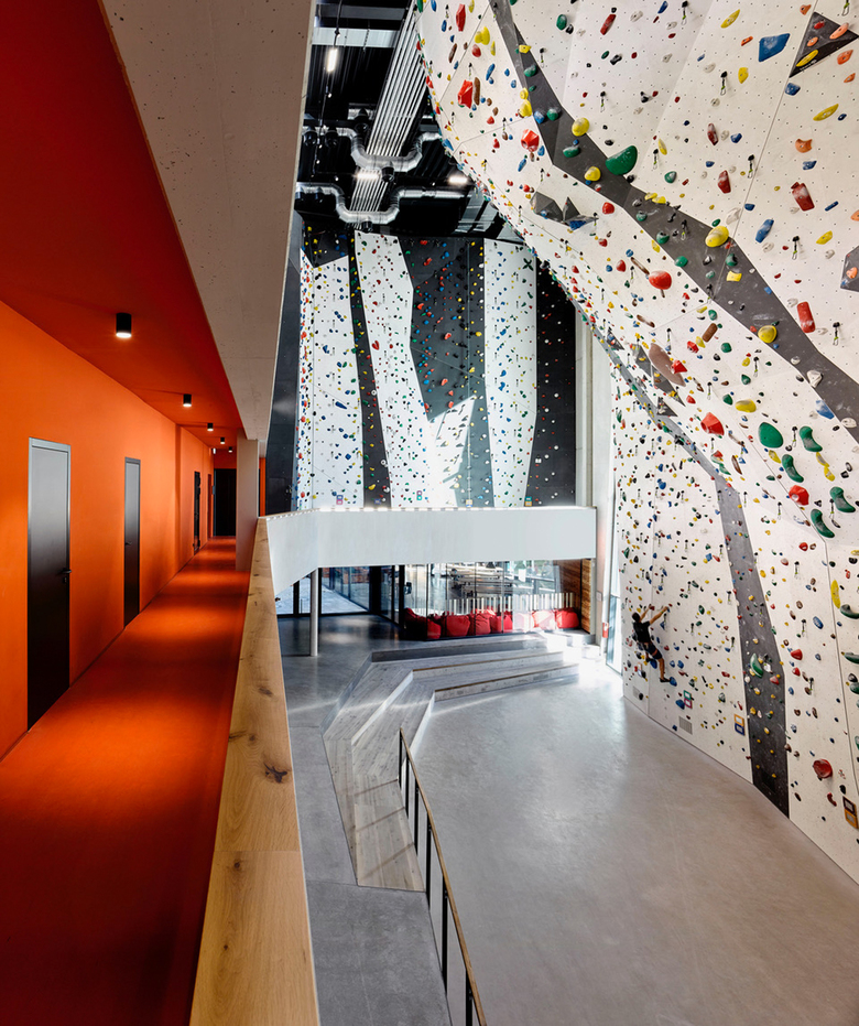 Neubau einer Kletteranlage mit insgesamt 2.150 m² Trainingsfläche, Seminiarräumen, Shop und Bistro. Wettkampfstätte für die Austragung europäischer Challenges in den Disziplinen Lead, Speed und Boulder. Innenliegende Galerien und Sitzstufen im Außengelände ermöglichen die Teilhabe eines größeren Publikums. Ein verglaster Gelenkbau zur bestehenden Kletterhalle ist Bistro und Aufenthaltsbereich.