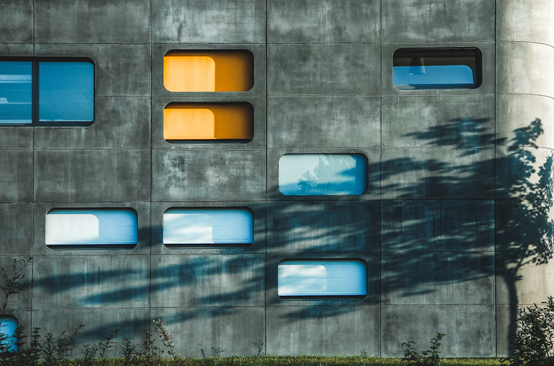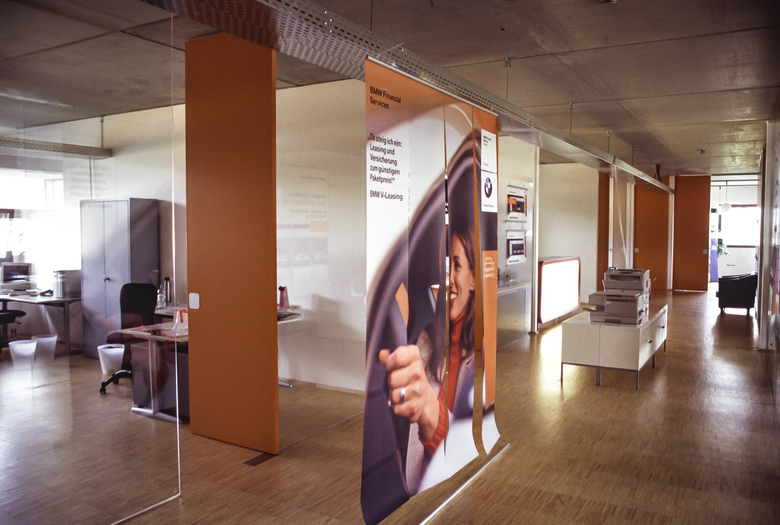 Einem Grenzstein gleich, markiert das Gebäude den nördlichsten Rand des Augsburger Stadtgebietes. Die unregelmäßige Kombination von standardisierten Modulelementen aus schwarz durchfärbtem Sichtbeton verleiht dem strengen Baukörper eine spielerische Fassadenordnung. Mit sichtbarer Solidität positioniert sich das Unternehmen selbstbewusst gegenüber dem heterogenen Allerlei der angrenzenden Industriebauten.