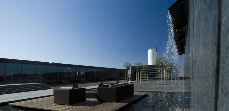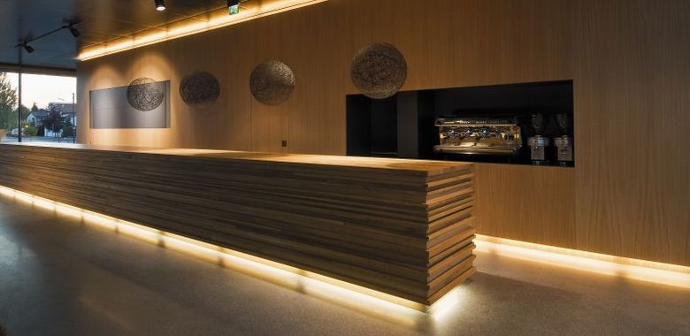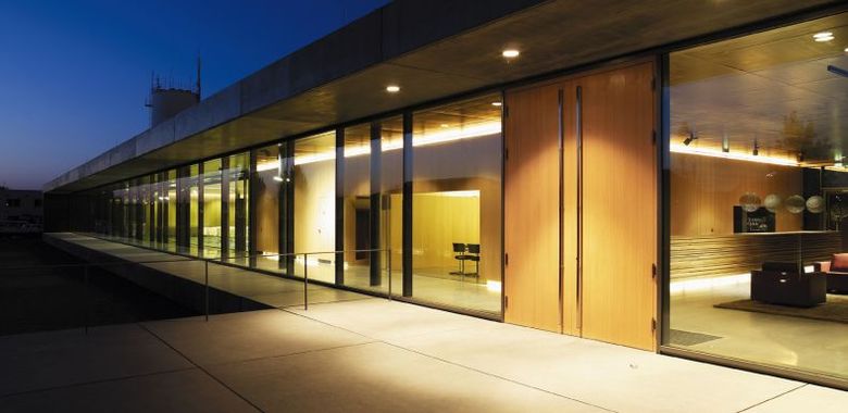 Vortragssäle, Schulungsräume und Ausstellungsbereiche ergänzen sich übergangslos mit einer ausladenden KundenLounge mit Kaminfeuer und PianoBar. Alle konstruktiven Elemente des Bauwerks sind aus schwarz pigmentiertem Sichtbeton gegossen. Die regenerative Bauwerksklimatisierung erfolgt ausschließlich über grundwassergespeiste Betonkernaktivierung.
