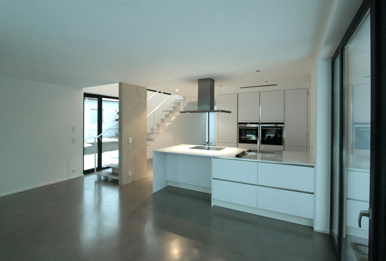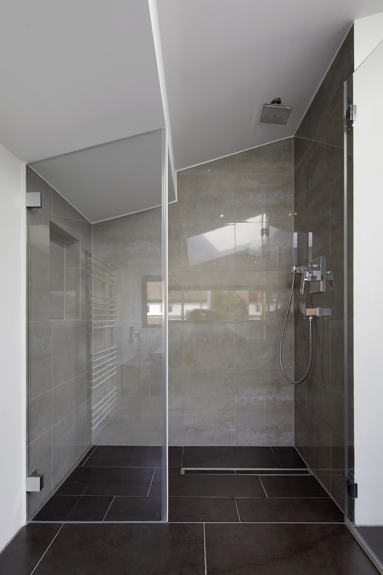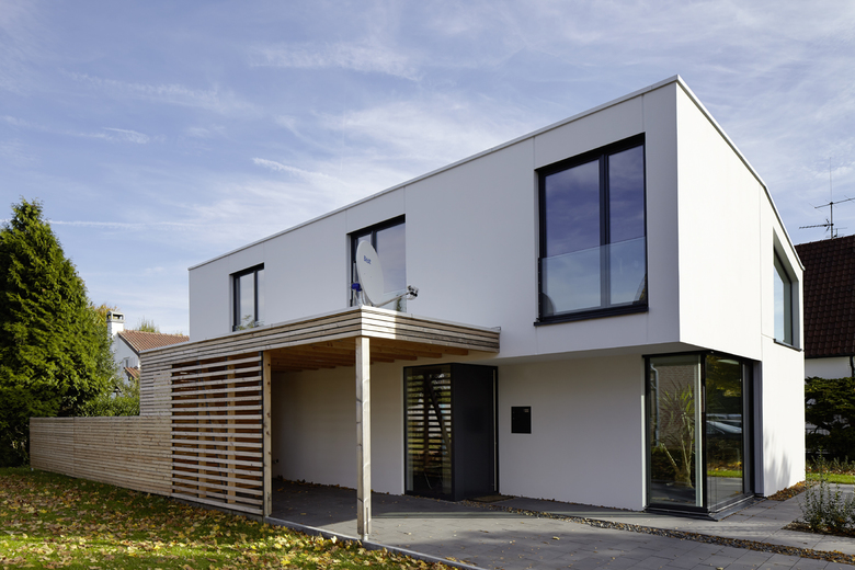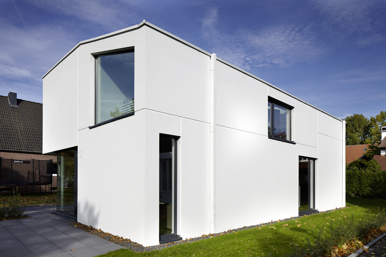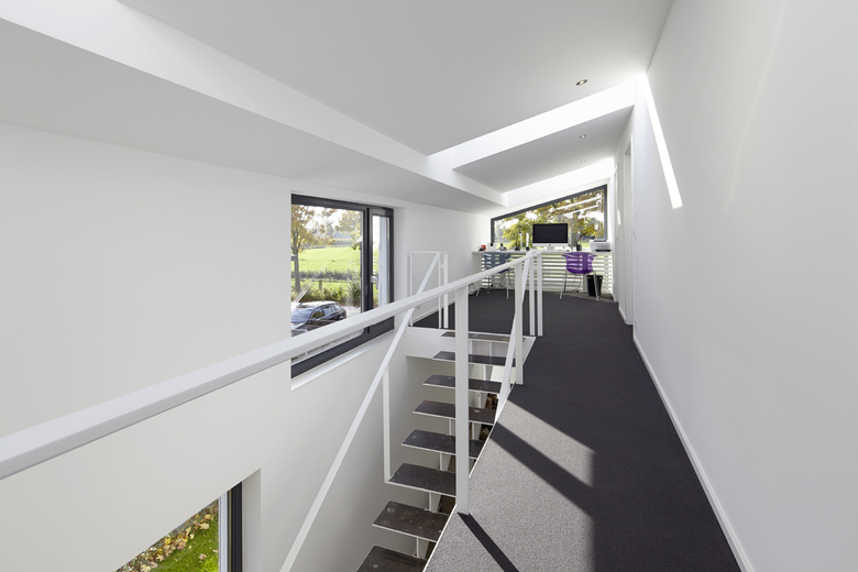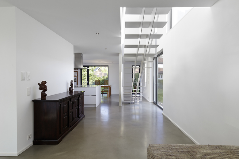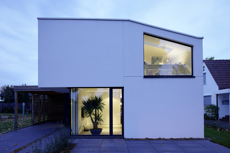 Nachverdichtung, ein ehemaliger Parkplatz am Ortsrand zur offenen Landschaft wird mit einem Einfamilienhaus bebaut. Das Grundstück ist schmal, das Baufenster ist eng, die Festsetzungen des B-Plans: Eingeschossig, geneigtes Dach und festgelegte Traufhöhe. Innerhalb der baurechtlichen Festlegungen entsteht das neue Gebäude als Interpretation der Vorgaben. Trotz der baurechtlichen Vorgaben hat das Haus ein Erdgeschoss und Obergeschoss. Im Erdgeschoss ist ein grosser, offener Wohnbereich angeordnet. Der Weg ins Obergeschoss verläuft über den grosszügigen Luftraum der Stahltreppe, entlang der Arbeitsgalerie zu den einzelnen Zimmern. Glatte, weiße Wände und Decken, Betonfussboden und Erdwärme sorgen für eine behagliche und effiziente Wohnsituation. Die Fassade ist als weisse Putzfassade ausgebildet, grossformatige Fugeneinschnitte gliedern die Ansichten und ziehen die Öffnungen zu einem gemeinsamen Fassadenbild zusammen. Das Dach wird ebenfalls weiss ausgebildet. Das Gebäude entwickelt seine prägnante, monolithische Kubatur aus den baurechtlichen Vorgaben. Die zurückhaltenden Detailausbildungen mit innenliegender Regenrinne etc. unterstützen das minimalistische Erscheinungsbild. Der grosszügige Dachfensteraufbau ermöglicht die gute Kopfhöhe im Obergeschoss und sorgt für eine lichtdurchflutete Raumsituation.