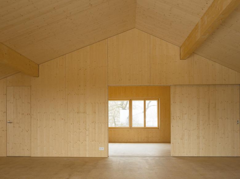 Als Referenz für den Anbau dienen die Scheunen in der Umgebung mit ihrem landwirtschaftlichen Charakter, ihren organisch gewachsenen Baukörpern und ihren einfachen Holzverkleidungen. Für alle neuen Bauteile wurden vorfabrizierte Holzelemente verwendet, bei welchen innen die unbehandelten Holzplatten und aussen die ungehobelte Holzschalung sichtbar ist. Für die Innenwände und Innentüren wurden dieselben Holzplatten eingesetzt. Der Boden besteht aus einem Zementestrich, welcher mit einem leicht ocker gefärbten Steinöl behandelt wurde. Durch die Materialisierung wirkt der Innenraum wie eine einheitliche Schale.
