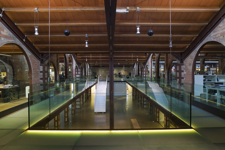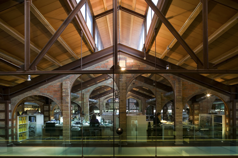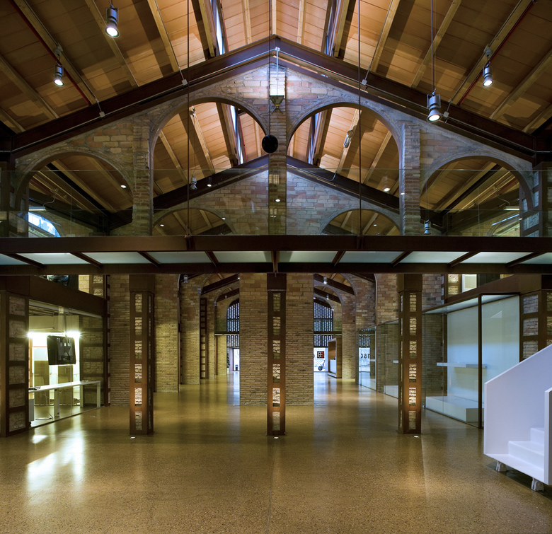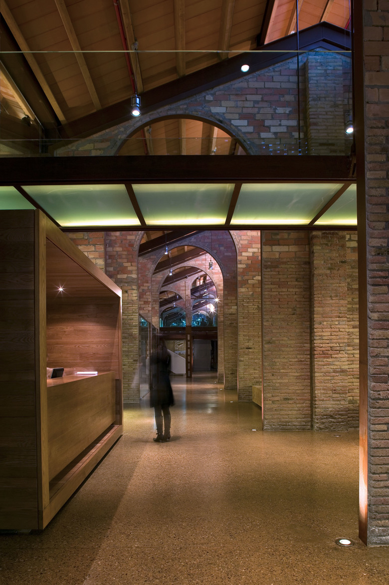 ESPAI BARONDA. A NEW POLIFUNCTIONAL BUILDING IN ESPLUGUES DE LLOBREGAT. BARCELONA Situated in Parc dels Torrents one of the best urban interventions in the city of Espluges, the "Espai Baronda" complex, has arisen from the recovery of a piece of authentic "architectural archaeology"; an old ceramics factory which fell into disuse more than two decades ago, in a city like Esplugues, with such a deep-rooted tradition in ceramics. Espai Baronda appears as a grand container for activities and spaces favouring the synergies of the companies involved in building (TAU-ICESA group), architecture (head office of Alonso, Balaguer Architects and Associates) and several Engineering companies, with multiple shared complementary services (restaurants, board rooms, an auditorium, parking, security services, etc.). The refurbishing of the building has been carried out with absolute respect for the original materials, as well as the size of the building. Consequently, ceramics are used on the exterior of the building, in the form of a perforated double skin, on the east and west facing façades, which generates, on the one hand, a formal and volumetric respect for the original form, and on the other, a true "thermal blanket" where all kinds of machinery and installations are located, all of which can be inspected using the metal mesh-design walkways, thus freeing up the visual aspect of the complex and especially its 5th facade, from any disturbance from visible installations. A grand hall, with a double height ceiling, welcomes the visitor to a floor constructed in the form of a "T". A suspended glass-covered walkway gives a light and airy feel to this connecting element. This hall serves as a distributing point to the other spaces, and at the same time doubles as an area for temporary exhibitions, including the biennial local ceramic exhibition, fashion catwalks, civic presentations,... a space well equipped for maximum functional flexibility, adapting itself for multiple events. Its very powerful scenic and visual component is intensified by safeguarding its previous industrial atmosphere. Simultaneously, a large space for seminars and conferences, which can be subdivided into 3 rooms for small and medium-sized gatherings, provides complementary facilities for the businesses and activities in the complex. The intended synergy of uses between private and public activities manifests itself here fully due to the multiplicity of uses and opening hours in all spaces, consequently these rooms like the grand central hall are made available to the local citizens through City Hall itself, which has new exhibition and civic areas at its disposal. The reconstruction of the original skylights, together with the dappled light from the double skin of the façade, bring an extraordinary luminosity to all the interior spaces, and this is further enhanced by the double ceiling height of the hall which traverses most of the building. A new public space, attached to the present one, enhances the urban "grouping" of the complex, which has been complemented by a walkway and a lift, which helps to preserve the important gradient resulting from the existing river, which was previously landscaped and became the beautiful "Parc dels Torrents" nature park. Under this square, there is a parking area bathed in natural light thanks to various "fissures". Vegetation growing in the subsoil appears in all its splendour in the patios in the upper public space. The unnecessary appearance of forced ventilation systems is appreciated from a budget point of view and in relation to energy savings and visual impact, as well as the considerable saving on lighting during most of the working day. Thus, a space like that of the parking area, generally offensive and badly treated from a visual aspect, is converted almost into an extension of the public space, and given some extra colour by means of the graphic design used in signposting and numbering. A new concept in user-friendly space. A new adjoining public swimming pool completes the extensive range of activities found in the complex, and advantage has been taken of the foundations of the old building in order to provide changing rooms and toilet facilities in such a way as to integrate fully and sympathetically with the surrounding landscape. The uneven line of the sheet of water also helps create the desired integrative aspect. Here we have a definitive example of authentic sustainable economics, by means of the necessary and convenient synergies between private and public initiatives, which allowed and made possible the rehabilitation of an old "ceramics factory" ear-marked for demolition, and which has been assigned to new uses according to the times and with the precision of the moment. All this without abandoning in any way, the necessary contribution regarding historical-architectural sensitivity which the firm always champions.