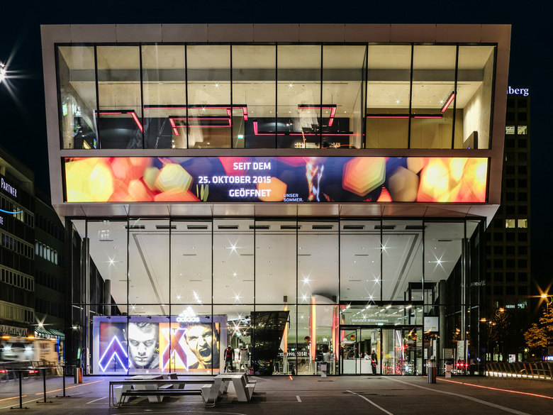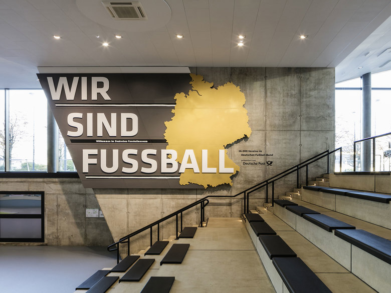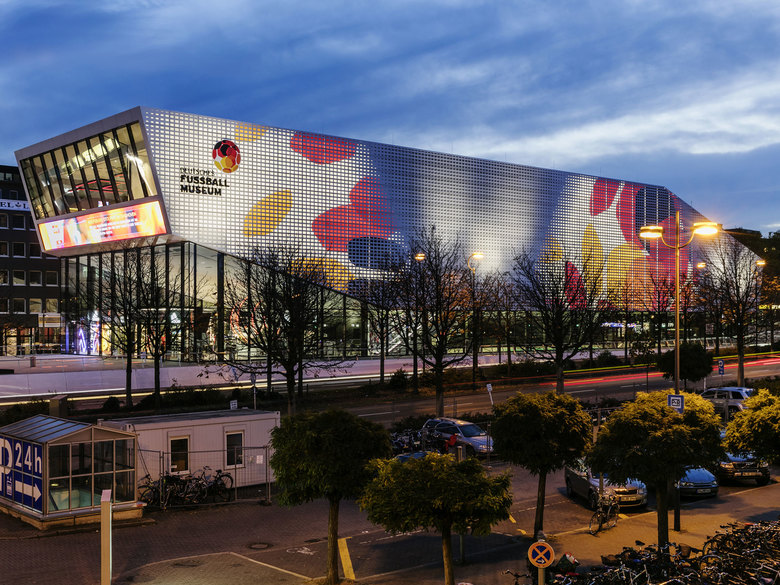 Das neu errichtete Deutsche Fußballmuseum am Hauptbahnhof Dortmund erinnert an diesen und noch viele andere Titel, Ereignisse und Emotionen, die den deutschen Fußball bis heute prägen. Seine Architektur trägt die Handschrift von HPP Hentrich-Petschnigg & Partner Architekten Düsseldorf. Der relativ schmale Bau nutzt die Rahmenbedingungen optimal aus und wirkt dank des Arena-artigen Auftritts, der Mediafassade im Eingangsbereich und des verglasten Foyer-Sockels auch in dieser Lage nicht zu massiv. Der Großteil der Hülle des Multifunktionsgebäudes ist mit einer hellen Metalllochfassade verkleidet, hinter der Banner mit DFM-Motiven wie verpixelt durchscheinen.