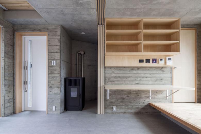 【留める】電力はフォークリフトに使われていたものを再生したバッテリーに蓄え、熱は蓄熱層に蓄えます。またペレットストーブの熱は室内のコンクリートに蓄熱され、温度変化を緩やかにします。