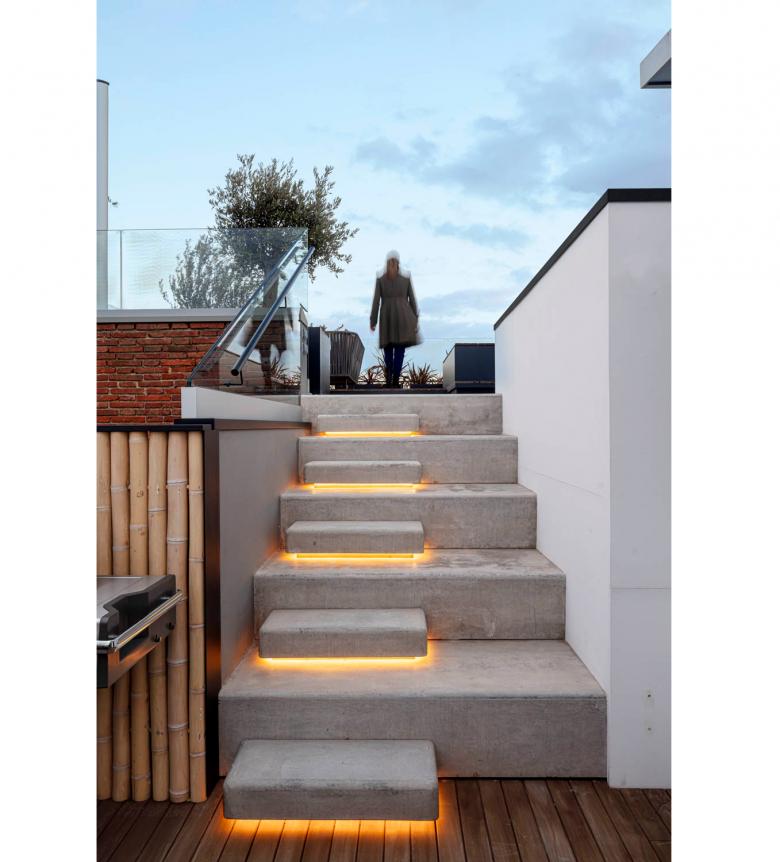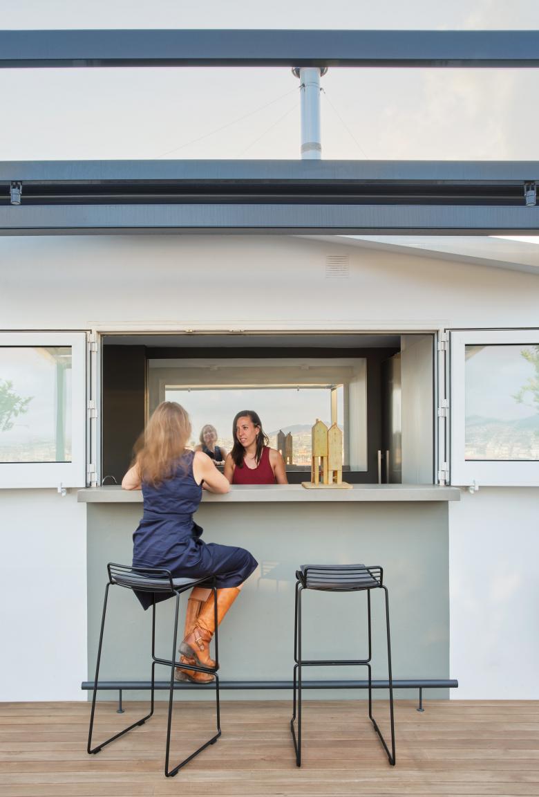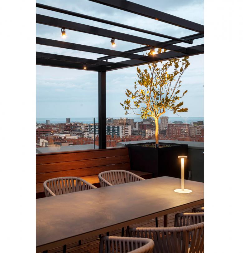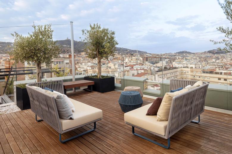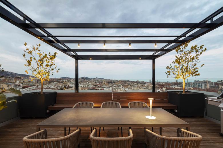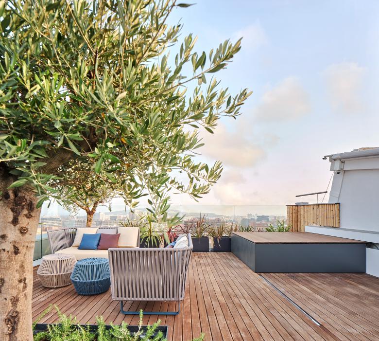 Two big private terraces complement the penthouse in the outdoor space. The first level linked to a party kitchen with a bar counter is used as a dining space equipped with a pergola and a large bench along the facade to enjoy the panoramic views framed by olive trees. The wooden deck on the highest level of the penthouse floats in a succulent landscape, includes an integrated jacuzzi and serves as lounge and sundeck. This space opens up completely to the spectacular views of the city of Barcelona and the sea.