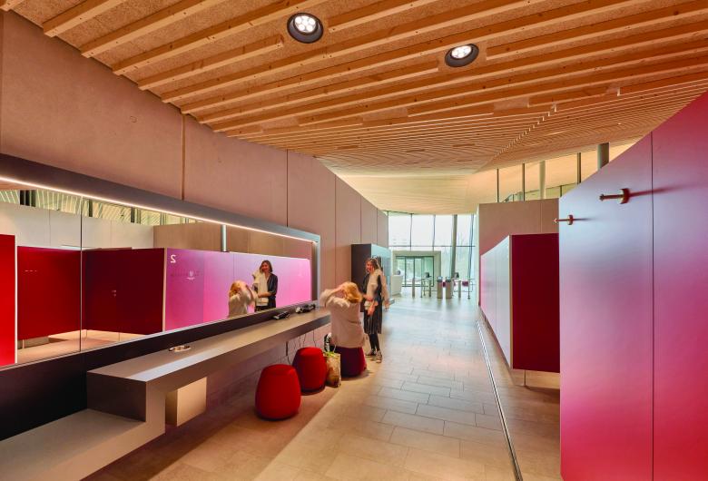Ankommende Badegäste treffen auf ein Gebäude, das trotz beachtlicher Größe angenehm kleinteilig wirkt. Charakteristisch in diesem Zusammenhang sind die großflächige, vor und rückspringende Glasfassade und die auskragenden Dachflächen, unter denen geschützte Übergangsbereiche zwischen innen und außen entstehen. Prägend sind aber auch die unaufgeregt natürlichen Farbtöne und Oberflächen. Im Foyer fällt insbesondere das harmonische Miteinander der Materialien ins Auge: im wilden Verband verlegte, 30 x 60 cm große cremebeige Bodenfliesen der Serie Nova, die Deckenbekleidung aus Fichten-Kanthölzern und einige Sichtbetonwände. Den ersten leisen Farbakzent setzen rote Sichtschutzwände, die in den angrenzenden, ebenfalls mit cremebeigen Bodenfliesen der Serie Nova ausgestatteten Umkleidebereich überleiten.