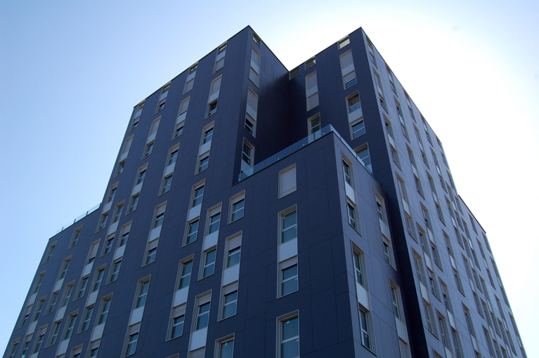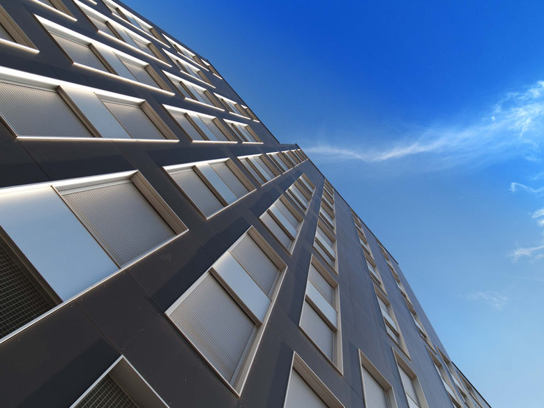 Las fachadas se proponen tensas, formadas por tres hojas independientes y construidas en seco con tecnología de fachada ventilada. Se resuelven con una única carpintería tipo y se estructuran en base a una malla modular estricta de macizos y huecos. Para acentuar la aparente esbeltez del edificio se aplican tres recursos compositivos: las ventanas se agrupan en vertical cada dos plantas, se disponen al tresbolillo en altura, y se eliminan irregularmente en columnas alternas en la sección superior de las fachadas.