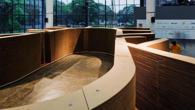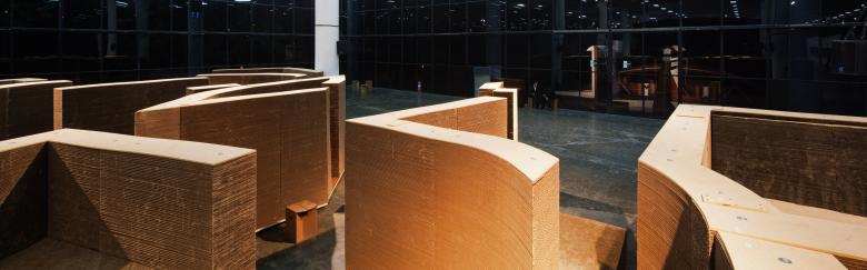 Upon the invitation of the curators Moacir dos Anjos and Agnaldo Farias, Vazio S/A participated in the terreiro “The Other, the Same”, an arena for dance, theatre, and music events that could be rearranged in several ways. Composed of movable trolley modules made out of stacked cardboard, the arena could be prepared as a theatre for shows, isolated from the rest of the exhibition, but could also be expanded (magnifying its space), amalgamated (turning into a maze), shrunk (thus creating lanes, corners, and residual spaces), scattered (diluting its presence to the point of near-invisibility), or simply put to use as benches and chaise lounges for visitor relaxation.