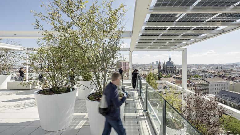 querkraft konnte sich in einem dreistufigen Architekturwettbewerb mit mehreren Workshops durchsetzen. Bereits im Briefing formulierte der/die Bauherr*in den Anspruch „We want to be a good neighbour“. querkrafts Lösung für diesen Anspruch zeigt sich in einem Gebäude, das auch für die Umgebung einen Mehrwert darstellt. Die der Öffentlichkeit zugängliche Dachterrasse mit Möglichkeiten einen Kaffee zu trinken, zu entspannen und die Aussicht auf die Stadt zu genießen, sowie das viele Grün auf allen Fassadenflächen - all dies trägt zum „guten Nachbar“ bei.