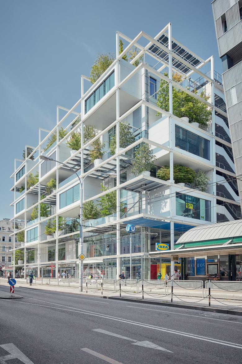 Bäume in der Fassade und am Dach beeinflussen das Mikroklima spürbar. Durch die dreidimensionale Bespielung mit Bäumen sind mehr Pflanzen vorhanden, als dies auf der Grundfläche möglich wäre. Eine der wichtigsten Maßnahmen im „Urban Heat Island-Strategieplan“ der Stadt Wien ist die Begrünung. Die Rankpflanzen und Bäume des IKEA Einrichtungshauses wirken kühlend und befeuchtend – eine natürliche Klimaanlage. Auch auf der Fußgängerebene wird so die Lufttemperatur verbessert. Computersimulationen ergaben eine relevante Temperaturabsenkung von 1,5 °C.