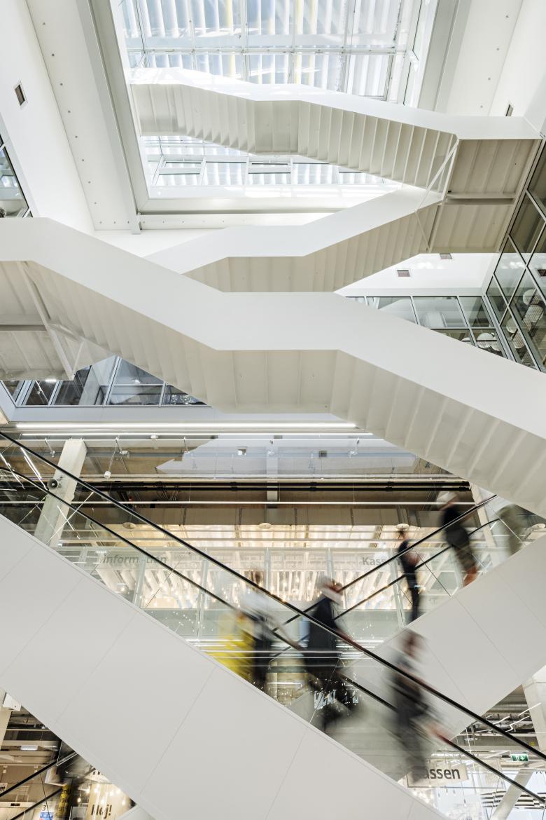 Die vorgefertigten Stahlbetonstützen folgen einem Raster von ca. 10 x 10 Meter, was eine vielseitige Nutzung und Gestaltung der Räume ermöglicht. Die Adaptierung an sich verändernde Anforderungen ist ein einfaches, was sich bereits jetzt zeigt. In den unteren Geschossen finden man den IKEA Retail in den oberen zwei Stockwerken ist das Jo&Joe-Hostel mit 345 Betten untergebracht. Durch diesen Mix wurde ein Haus geschaffen, das 24 Stunden 7 Tage die Woche lebt.