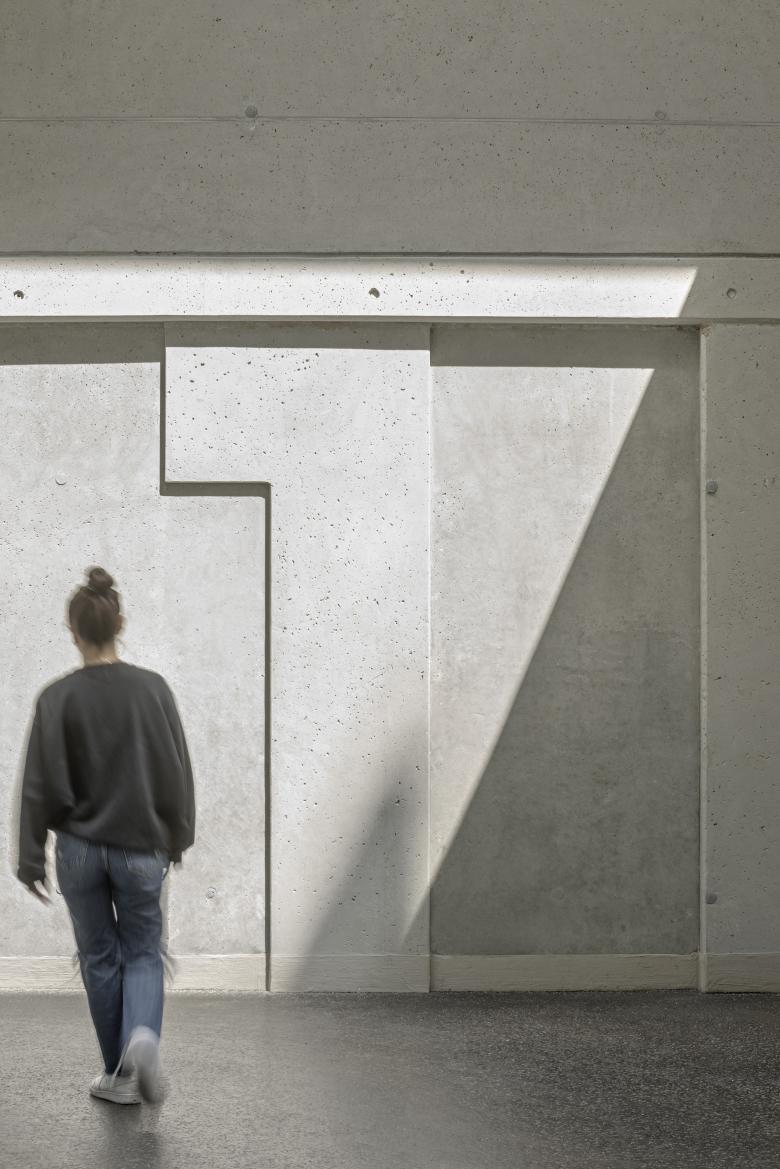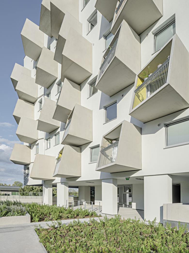 Das vielleicht auffälligste Merkmal der neuen Wohnanlage sind die auskragenden Loggien. Diese vorgefertigten Betonelemente sind an der nordwestlichen und südöstlichen Fassade jedes Gebäudes angebracht. Durch die Schwenkung wird der Blick nach außen und in den privaten Bereich bewusst auf die Donau gelenkt. So bleibt der Außenraum privat und der besondere Blick erhält die Aufmerksamkeit, die dieser Ort erfordert.
