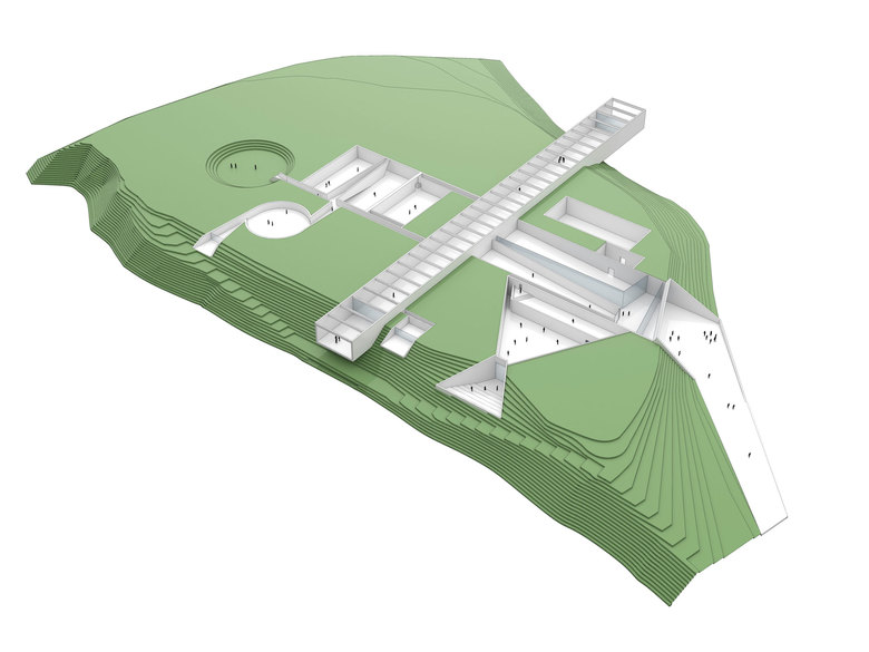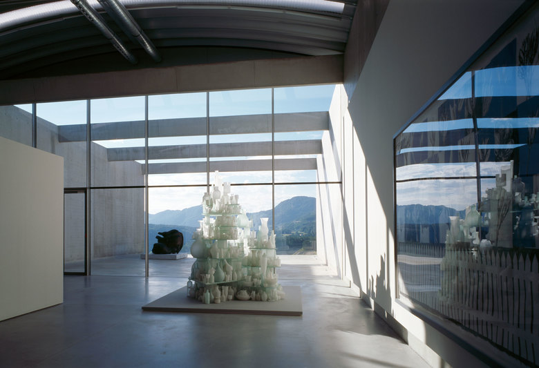 Antwort – Aus Kostengründen und zur Optimierung des Energiekonzepts liegen 95% der Kubatur unterhalb der Erde - der Erdaushub wurde auf dem Grundstück verteilt. Man betritt das Museum über das großzügige Schaudepot, den "Weinkeller der Kunst" und erreicht die helle Haupthalle an zentraler Stelle. Als Gegenpol zur kontemplativen Kunstbetrachtung finden die Besucher dramaturgische Höhepunkte durch die intensive Fokussierung auf die Landschaft. Niemals entsteht der Eindruck, sich unter der Erde zu befinden. Auch bei der Erweiterung des Museums wurde mit der Topographie der Umgebung gearbeitet.