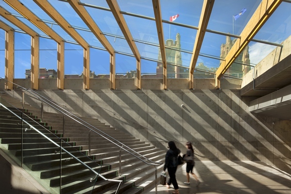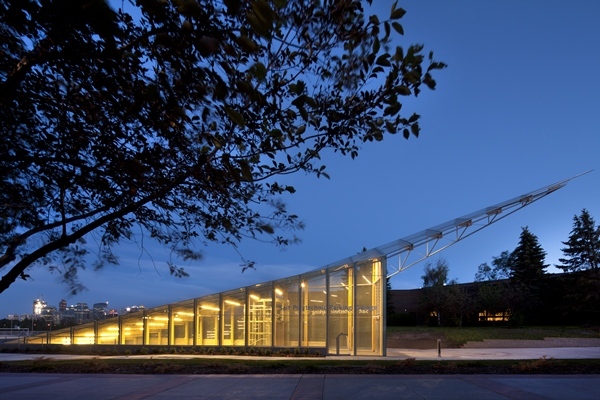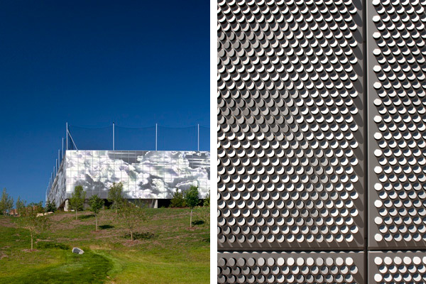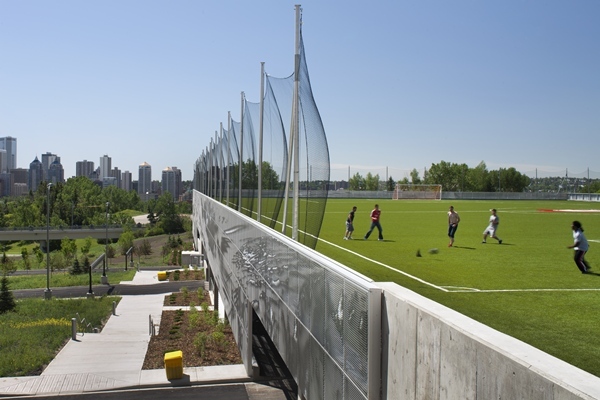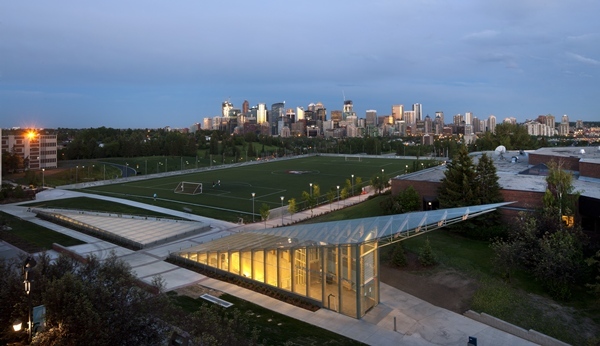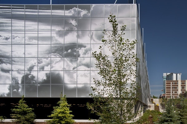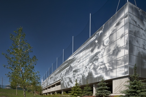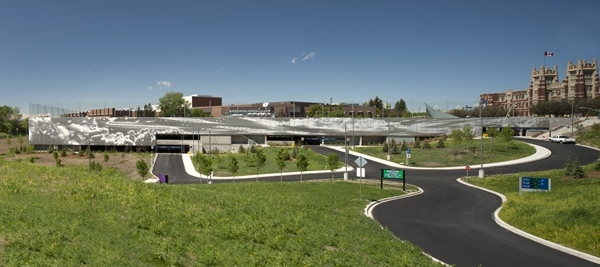 The incorporation of the site's topography in the design offered the opportunity to reduce the impact of the parkade, while maximizing natural ventilation and presenting major gains in construction cost efficiencies. By building under an existing field, the parkade integrates a green roof and preserves critical visual linkages between the campus and Downtown Calgary, while respecting the historic heart of the campus. BTA collaborated with an artist to develop a unique screen mural on the exposed sides of the parkade thereby creating a huge public art wall. Made up of thousands of holes punched into the metal screen, the changing angle of the sun creates a pixilated image of moving clouds and the prairie sky.