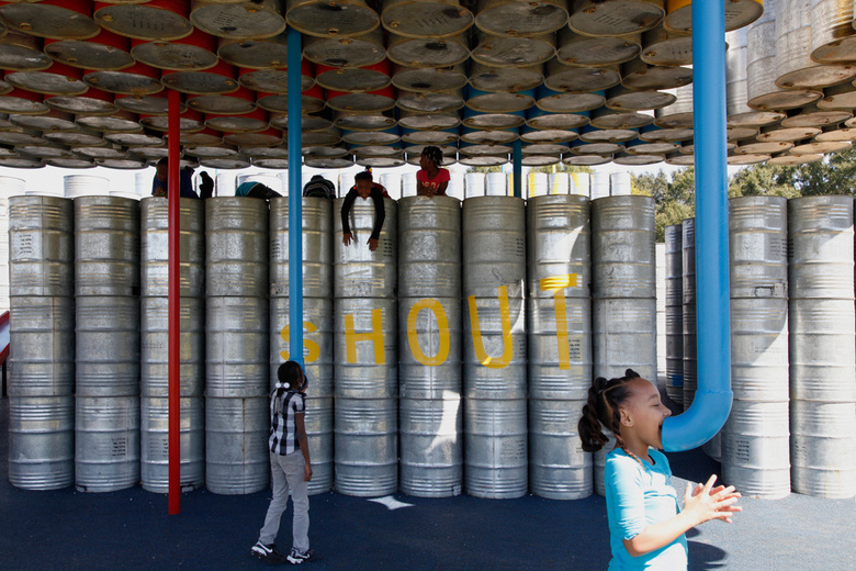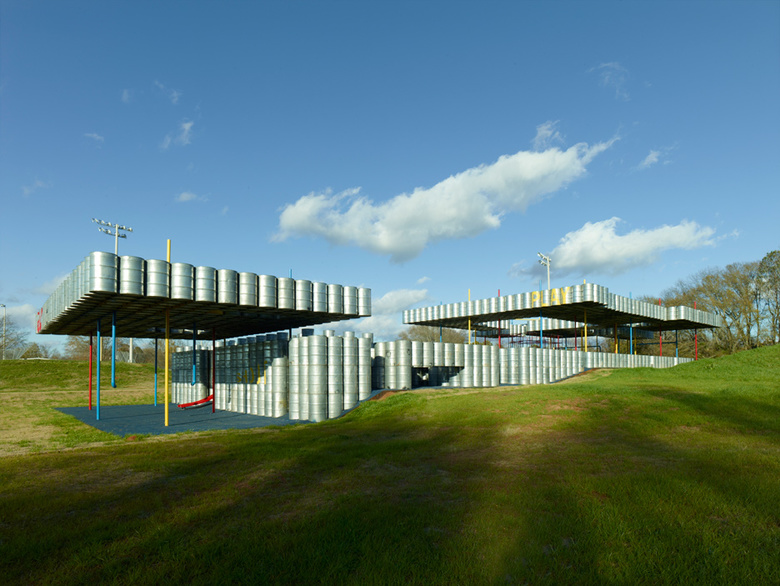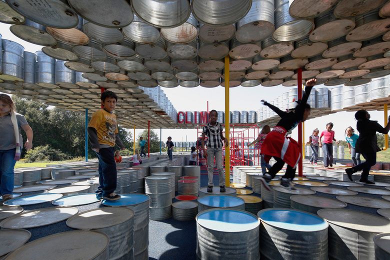 The Playscape team designed and built a maze of 55-gallon galvanized drums.