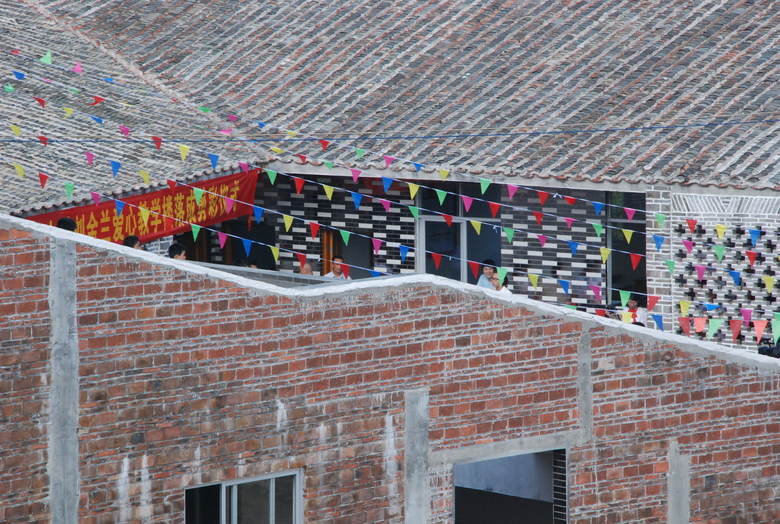 The Mulan Primary school is located close to Huaiji, a town of approximately 100,000 in Guangdong Province. Working with the local education authority and a Hong Kong based charity we were asked to expand an existing primary school of 5 classrooms by adding an additional building of 6 classrooms. The motivation behind this expansion is through the education authority’s desire to consolidate the total number of primary schools. In the process some older schools will be demolished and others enlarged to make up for the loss and also to provide for a larger sphere of population distribution. The existing school is a simple tiled roof block with an overhanging eave supported on columns. The building forms part of an edge of a wall which frames a courtyard. The strategy of the design was to not only extend the school but to also extend the courtyard and organize the site through a series of linked open spaces.