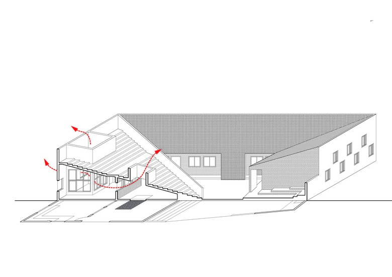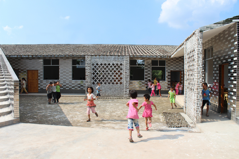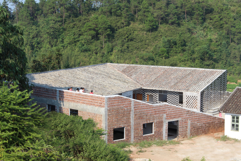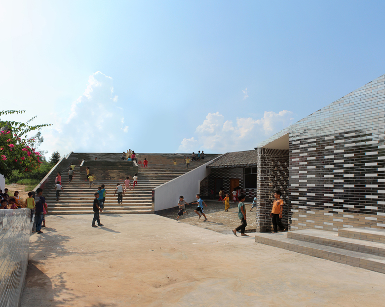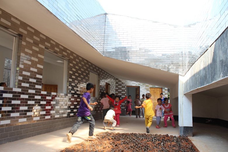 The new building defines the edge of the site as a U-section with one side of the courtyard left open. The roof plane is a continuous ribbon that rises from the ground as a series of steps forming a new public space and outdoor classroom that then becomes roof, before dropping down again to form a ground plane that defines the edge of the courtyard. The steps are punctuated with small micro-courtyards which continue into the library which has its own internal courtyard. The roof is clad in old, recycled tiles collected from numerous villages in the local area as old buildings are replaced with new concrete and tiled houses. At three moments the roof tiles become vertical walls which direct water off the roof into the ground. This perforated screen walI will encourage climbing plants cooling the air in the hot summer months. In contrast to this rough-tile, smooth, mirror-tiles are deployed on the courtyard façade and on the vertical faces of the steps. This creates visual mirages and distorted reflections that are animated as the children play in the courtyard and on the steps during break time. As the village evolves and grows it is hoped that through the provision of this open public space and library that the school can become a community focal point and open to all.