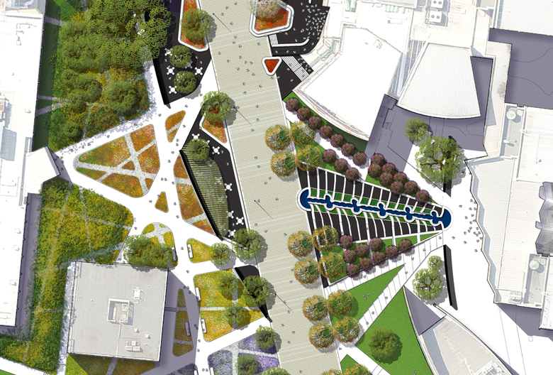 The project delivers a 160m long, multi-coloured granite paved spine with fully compliant access to 13 different buildings set on as many different floor levels.