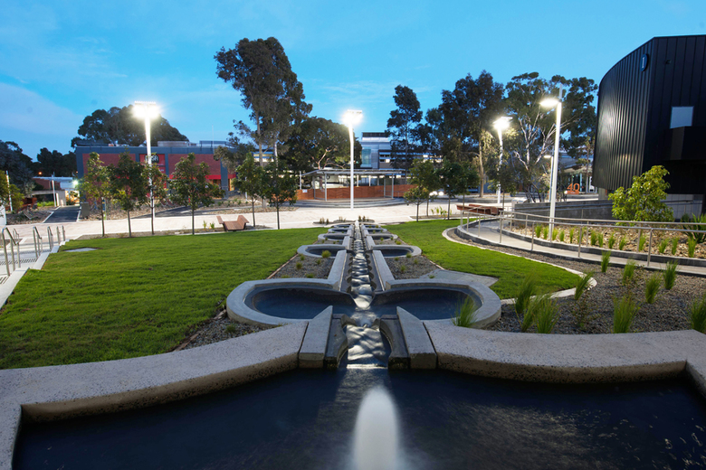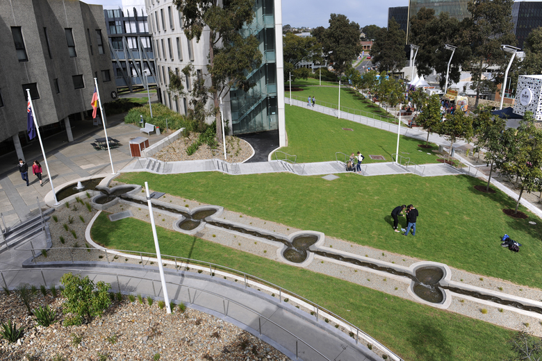 Integrated pole-top solar panels supply power to the grid. A 6.0 metre clear zone with a setback creates rational circulation and marquee zones for frequent events. An extensive dryland garden sequence has been installed with planting design by Paul Thompson. This contrasts strongly with an enlarged, irrigated campus green sward, creating three new, different, and landscape characters on the site.