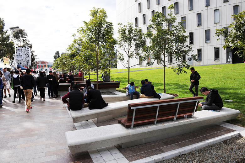 This design has rebuilt the centre of the Deakin University campus at Burwood. The existing campus spine was narrowed down and paved in 6 tonnes of granite. An asymmetric cross section for the space develops a two sided programme: a double row of new shade trees with custom seating, and a dramatic row of 12.0 metre light columns carrying LED flat panels.