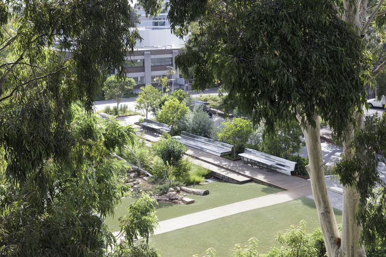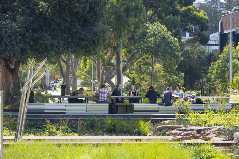 The award jury cited the project as: “Stage one shows a meaningful commitment to sustainability and the principles of WSUD, while at the same time offering a calm sense of place for students, with seating for individuals and groups integrated into the design. Stage two reads as a distinct landscape space, with curved edges relating the design to The Spill. The jury commends the design team for its playful yet sensitive approach to program, thoughtful planting and robust design solution.”