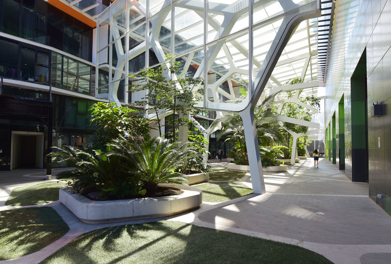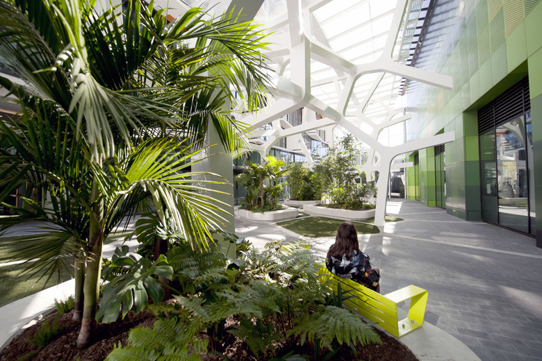 Rush Wright Associates worked to create a rainforest plantings are derived from mixed Australian and exotic flora, while light levels are augmented twice daily in the cool season to ensure appropriate day length and lux levels for healthy plant growth. Light levels were extensively modelled at design stage, and to minimise the need for artificial light. Glass selection, frit, primary and secondary steel were all modelled to check illumination, with the assistance of Inhabit Group, ESD Engineers. Predictions have been audited on site and models recalibrated, validating the software and studies of the design stage. This creates a benchmark for future study.