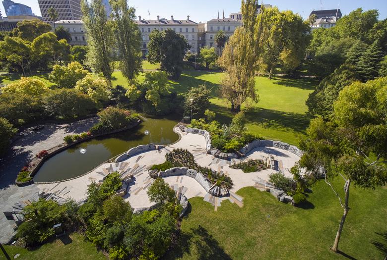 For this reason, the design has evolved to become a ‘garden memorial’. This strategy differs from other memorials in Melbourne’s parklands, which are typically individual sculptures or objects placed into the larger parkland scene.