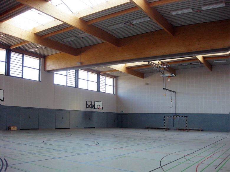Das dem Baugrund geschulderte Versenken des halben Baukörpers führt zu einem - zwar großen - aber dennoch eleganten Baukörper, der durch den weiten Dachüberstand nach oben eine klare Begrenzung erhält. Sporthalle, Umkleiden und eine Gymnastikhalle wurden auf der Ebene -1 untergebracht, so daß des Erdgeschoss für die Erschließung, Tribünen und Vereins- und Nebenräume freigehalten werden konnte. Die Haustechnik konnte vollständig im Gebäude untergebracht werden. Die gesamte Dachfläche kann dadurch für eine Photovoltaik-Anlage genutzt werden.