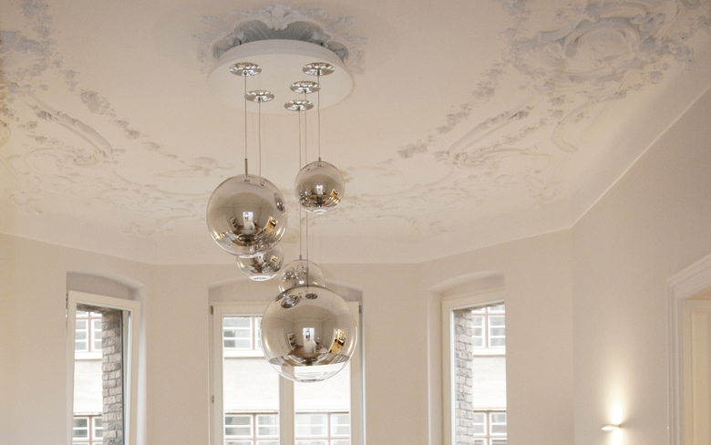 Trotz Erkern wirkt das Gebäude mit seiner Klinkerfassade und seinen großen Fenstern von außen recht nüchtern. Auch innen sind nach der Kernsanierung nur wenige Stilelemente aus dem 19. Jahrhundert erhalten geblieben: so zum Beispiel die profilierten hohen Doppelflügeltüren und vereinzelt Stuckdecken. In dem Spannungsfeld aus klassischen Altbau-Stilelementen und nüchternen vier Meter hohe Räumen ist die neue Innenarchitektur des Ladens entstanden. Eiche-Vollholzparkett ist durchgängig im Fischgrätmuster verlegt. Doch anders als bei der klassischen Diagonalverlegung aus Einzelstäben ist es hier mit Doppelstäben streng orthogonal angeordnet. Im Empfangsbereich sind verspiegelte Pendelleuchten in unterschiedlicher Größe an der prächtigen Stuckdecke zu einer Gruppe zusammengefasst. Im angrenzenden Schneideraum sorgen weiß gestrichene, profilierte Altbautüren und glatt gespachtelte weiße Wände für eine Atmosphäre schlichter Gediegenheit. Im farblichen Kontrast dazu hängen an den Wänden kubische Sideboards aus dunkeler Eiche und großformatige Spiegel, die in kantigen, hinterleuchteten Rahmen gefasst sind.