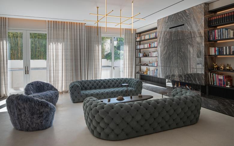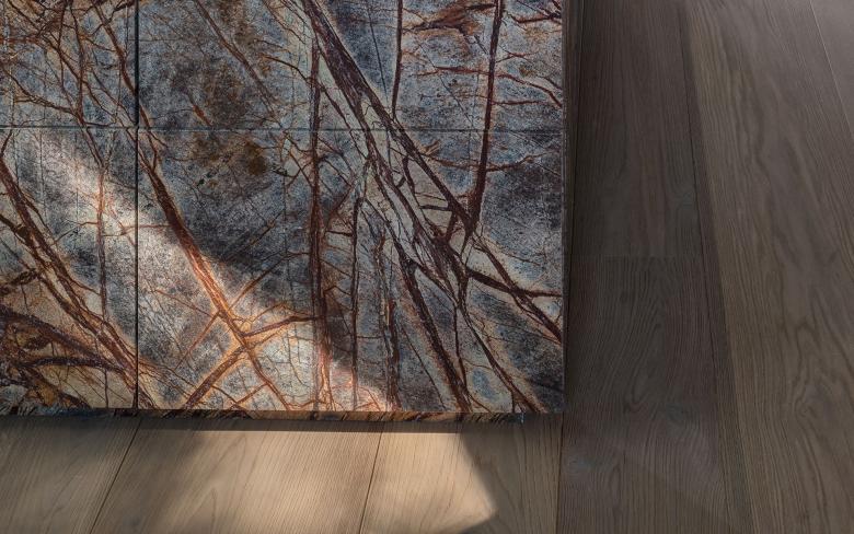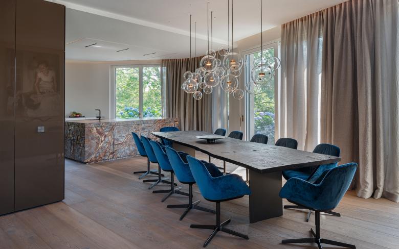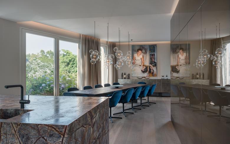 Zentral und frei im Raum steht ein glänzender Möbelkubus. Auf seiner Oberfläche spiegelt sich der umgebende Raum. Die Kochinsel ist aus Naturstein gefertigt, auf dessen gebürsteter Oberfläche sich ein Geflecht aus Gesteinsadern in unterschiedlichsten Braunschattierungen abzeichnet. Die Platte des Esstischs besteht aus vier Meter langen, geköhlten Eichenbohlen, deren unbesäumte Tischkanten den natürlichen Wuchs des Baums beschreiben. Im angrenzenden Wohnzimmer ist die Wandbekleidung über dem Kamin aus vor- und zurückspringenden rostbraunen Steintafeln gefertigt. Auf Knopfdruck fahren die beiden zentralen Steintafeln zur Seite und geben den Blick auf einen Fernseher frei.