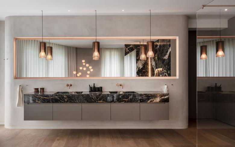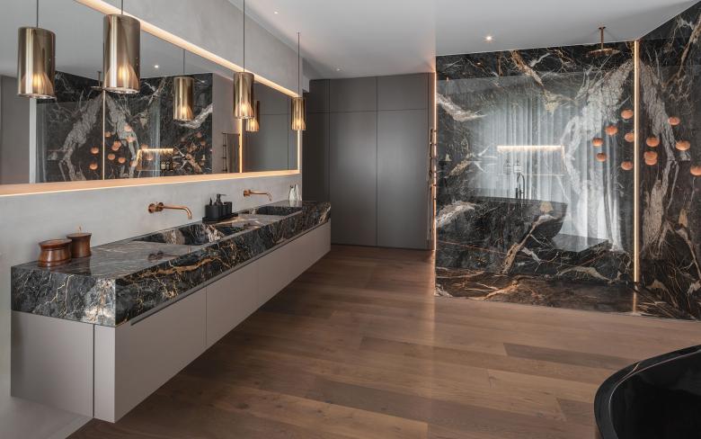 Im Gegensatz zu den warmen Naturstein- und Holzfarbtönen der Einbauten sind die Polstermöbel in kühlen Blautönen bezogen. Die Treppenläufe und die Fußböden in Staffel- und Obergeschoss sind einschließlich der Bäder mit bernsteinfarbenen Eichendielen belegt. Waschtisch, Dusche und Wannenpodest sind aus Nero Portoro gefertigt, einem exklusiven dunklen Marmor mit cremeweißer und bernsteinfarbener Maserung. Schmale Lichtfugen setzen stimmungsvolle Akzente. In den beiden Ankleiden sorgen sie dafür, dass die Decke über den Schränken zu schweben scheint. Die Abdeckungen der Wäscheblöcke sind aus massiver Bronze gefertigt.