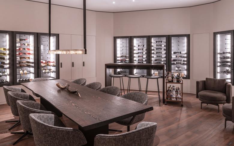 Im Untergeschoss des Townhouses ist eine Vinothek eingerichtet. Der Raum ist dreiseitig mit Wandnischen versehen, in denen beleuchtete Weinklimaschränke eingebaut sind.