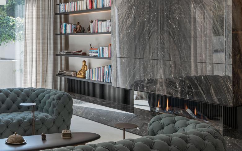 Das Herzstück des Erdgeschosses ist ein Aufenthaltsraum mit Billardtisch und Küche, der dazu einlädt, Gäste zu empfangen und Partys zu feiern. Mittig über der Feuerstelle ist die Maserung des polierten Marmors gespiegelt angeordnet. Das Farbspiel im Steins changiert von Beige, über Taupe zu Anthrazit und ist durchzogen mit weißen Kristalladern. Als Kontrast zu dem eleganten Marmor ist der Bodenbelag ein geschliffener Sichtestrich, der ursprünglich dem Industriebau entstammt. Er ist mit extraweißem Zement hergestellt und weist fertigungsbedingt leichte Farbunregelmäßigkeiten auf. Ein ähnliches Kontrastprinzip taucht im Nebenraum auf. Die Fronten der Küchenschränke und des Billardtischs sind aus einem graubraunen, matten Nanotech-Material hergestellt, das sich durch seine gleichmäßige Oberfläche auszeichnet. Die Rückwand der Küchennische hingegen ist mit bronzefarbenen Flüssigmetalltafeln belegt, die dank ihres handwerklichen Auftrags einen imperfekten Farbverlauf haben.