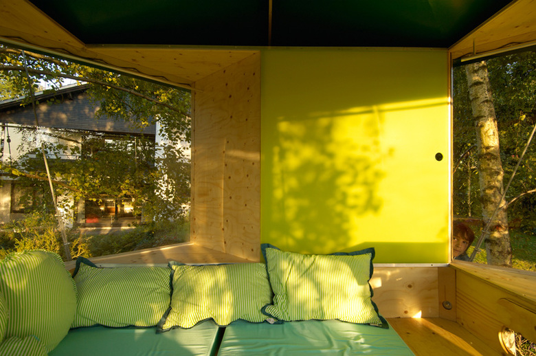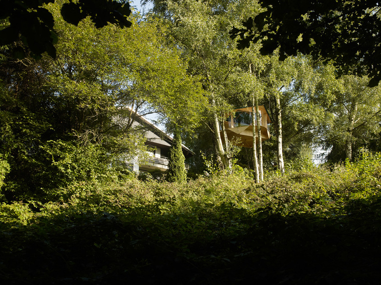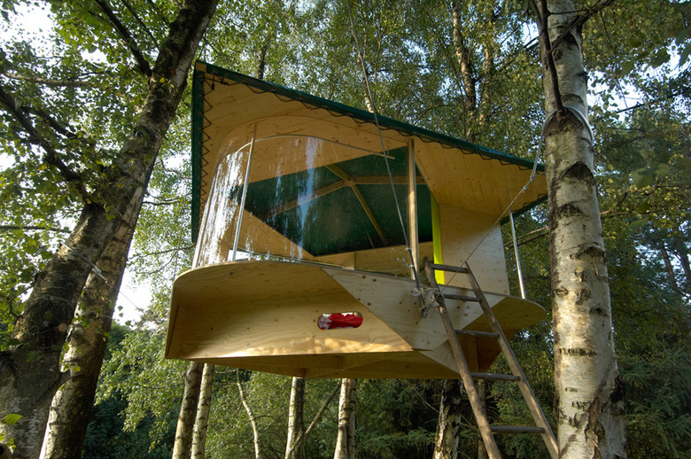 Der Bausatz kann von Familien problemlos gemeinsam aufgebaut und in den Bäumen positioniert werden. Mit seiner grünen Mütze aus Planenstoff hängt der kleine Holzbau zwischen den Bäumen und passt sich in seine natürliche Umgebung ein. Dabei hinterlässt er keinerlei Schäden oder Spuren, seine Stahlseile sind die einzigen Berührungspunkte mit den umgebenden Bäumen - gepolstert und in einem günstigen, steilen Winkel.