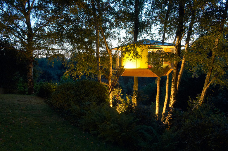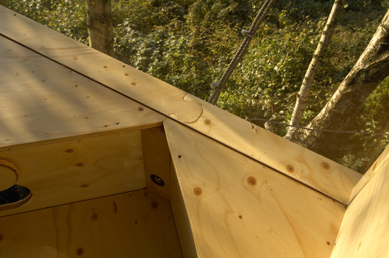 Wichtig für einen schwebenden Bau ist Leichtigkeit - sowohl optisch als auch physisch. Als Grundbaustoff kommen wetterfest verleimte, 21mm starke Platten aus WISA Spruce zum Einsatz, ein solides und preiswertes Material, das auch ästhetische Qualitäten hat. Seine hohe Steifigkeit erhält das Baumhaus aber erst durch die drei gleichförmigen, gebogenen Acrylglasscheiben, die herkömmliche aufwändige Aussteifungen überflüssig machen. Dies spart Gewicht und macht das Baumhaus in der Horizontalen fast völlig transparent. So werden Konstruktion und Geometrie zum entscheidenden, gestaltgebenden Element.