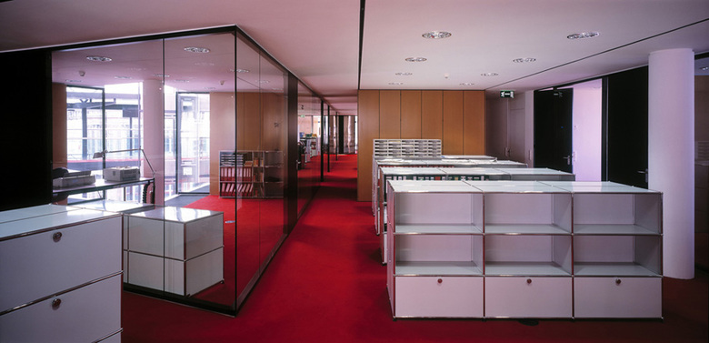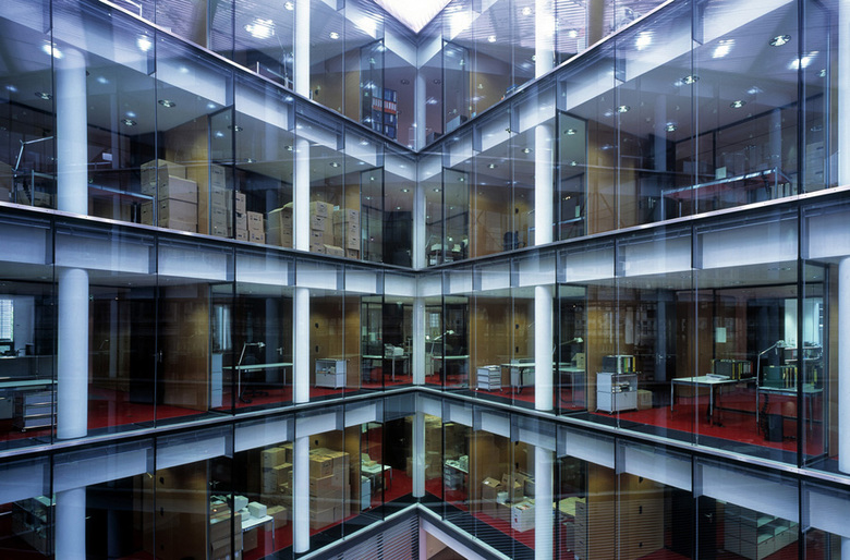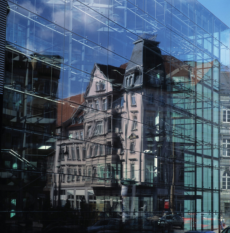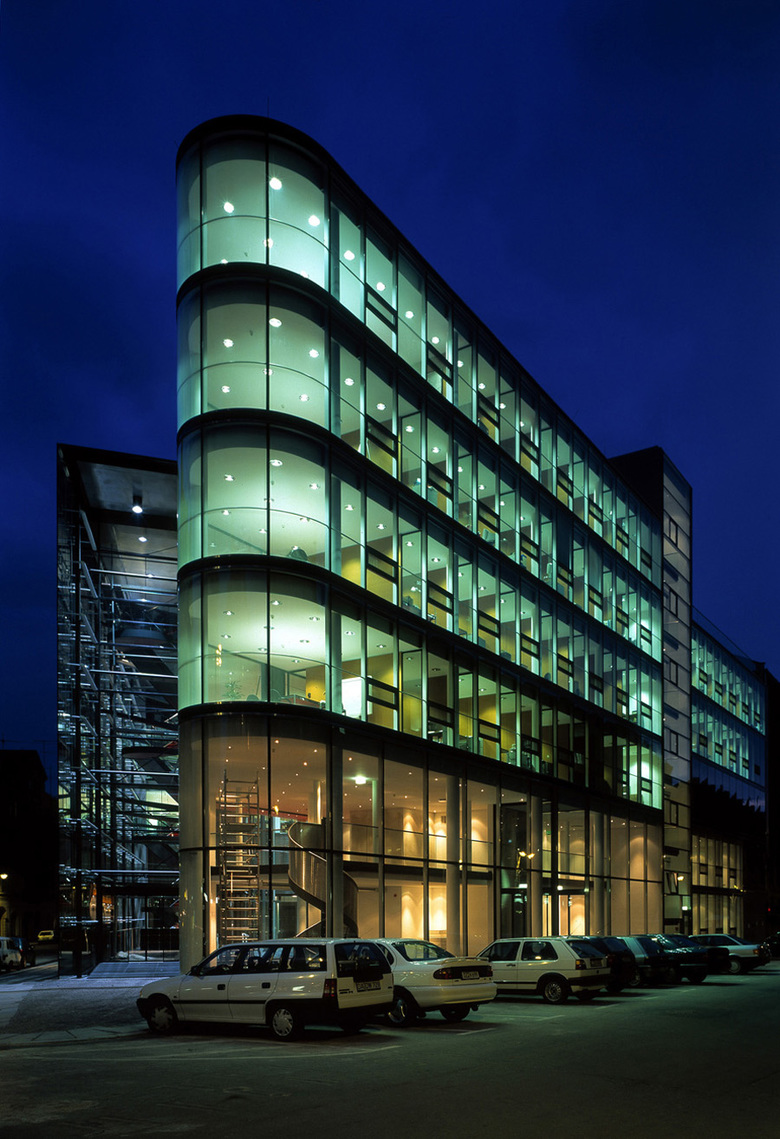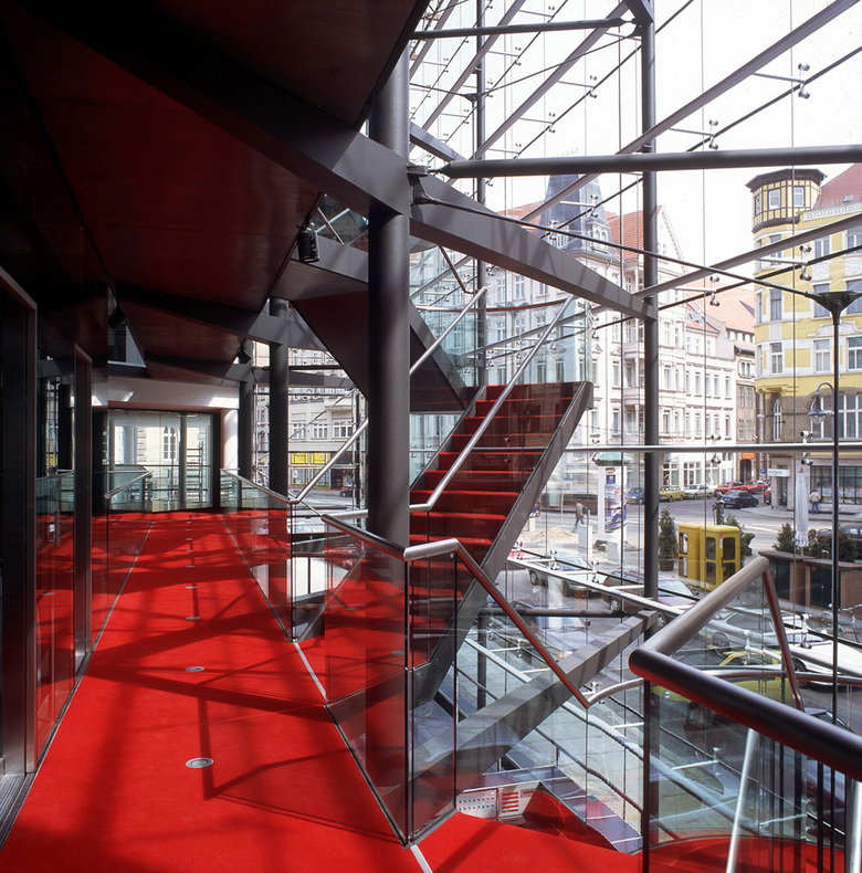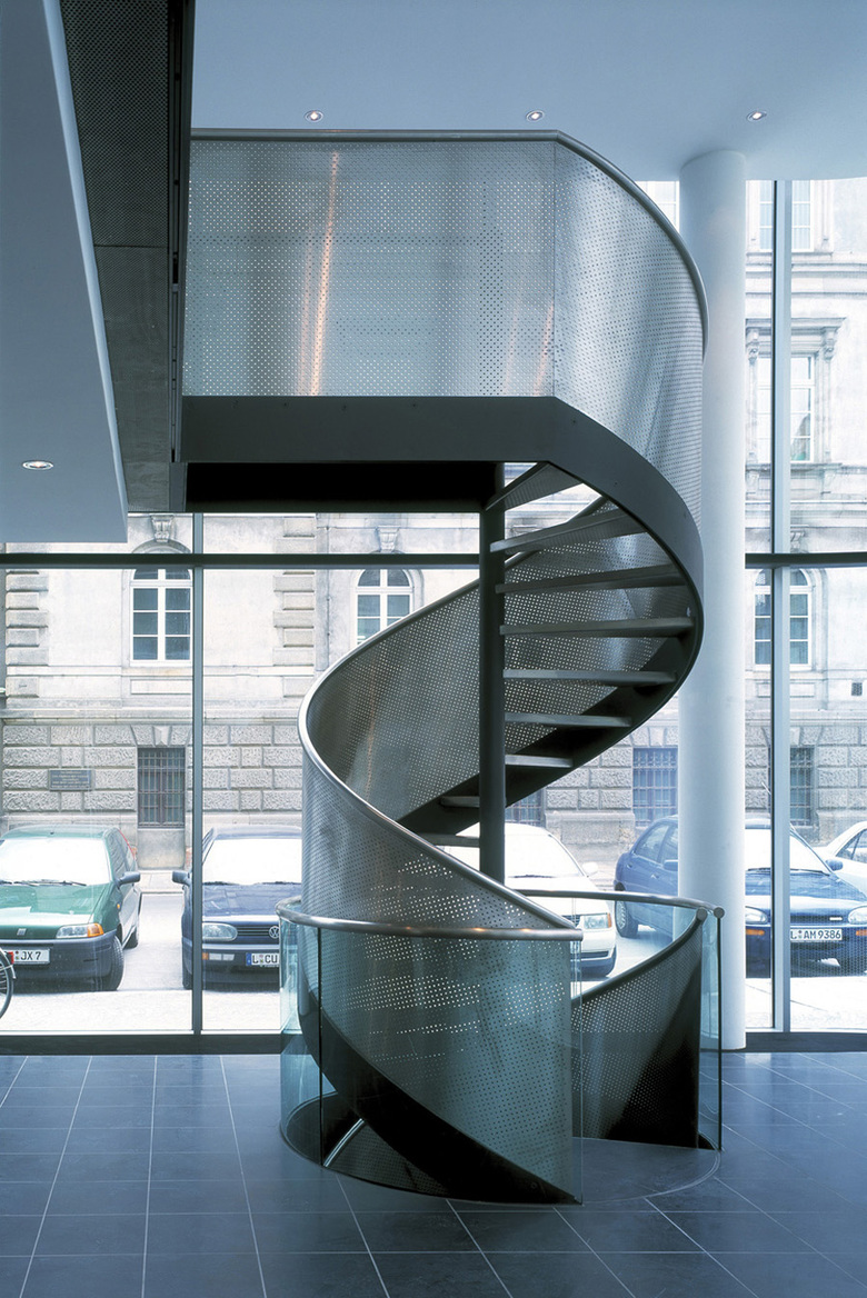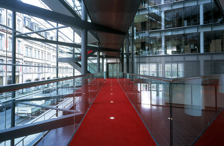 Die Kubatur des Gebäudes ergab sich aus dem dreieckigen Grundstückszuschnitt, der Lage zum Platz und den unterschiedlichen Höhen der angrenzenden Bebauungen. Belichtungsaspekte der Arbeitsbereiche machten die Einführung eines Atriums, das wir aus dramaturgischen Gründen zum vorgelagerten Platz hin außerhalb der Symmetrieachse des Gebäudes gelegt haben, erforderlich. Die Proportionen der Nachbargebäude haben wir akzeptiert, die Materialien und Gestaltungselemente ergeben sich aus den gegenwärtigen energie-, produktionstechnischen und repräsentativen Belangen.