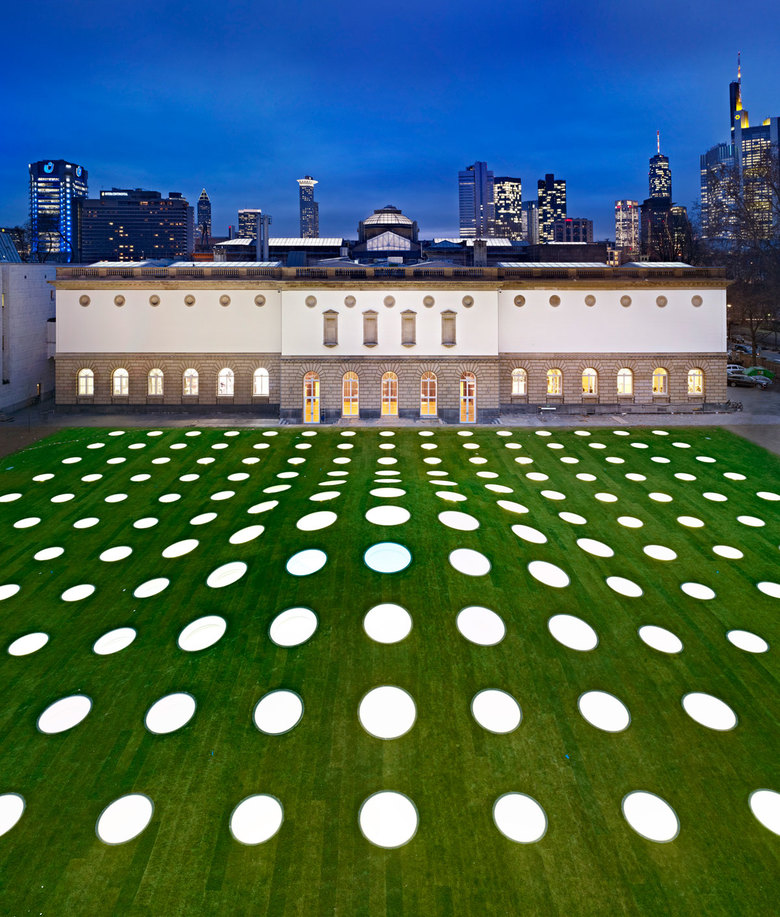 Über die gesamte Oberfläche der doppelt gekrümmten Deckenschale verteilen sich 195 Oberlichter, deren Durchmesser von 1,50 m in den Randbereichen bis zu 2,50 m am höchsten Punkt variieren. Diese speziell für das Städel entwickelten „Augen für die Kunst“ sind von außen begehbar und versorgen den Ausstellungsraum mit Tageslicht, welches durch integrierten LED und Sonnenschutzvorrichtungen verstärkt bzw. abgeschwächt werden kann. Die gesamte Decke wird von nur 12 schlanken Stahlbetonstützen getragen. 160 Bohrpfähle verankern den im Grundwasser liegenden Erweiterungsbau in der Erde und verhindern ein Aufschwimmen. Der Neubau wird durch 36 Erdsonden mit Wärme (im Winter) bzw. Kälte (im Sommer) versorgt, die bis zu einer Tiefe von 82 m im Boden stecken.