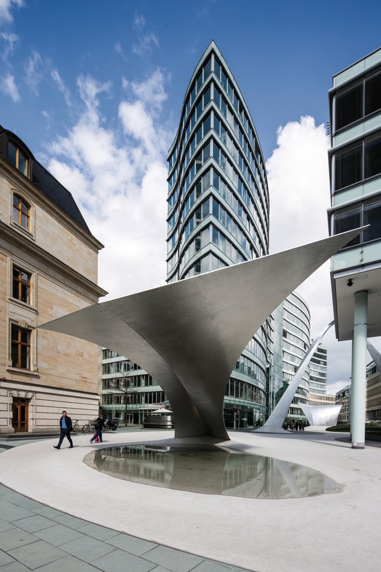 Gefragt war eine Neugestaltung der Außenanlage zur Aufwertung des Bürokomplexes „die welle“, nahe der Alten Oper in Frankfurt am Main. Der Name des Gebäudes gab den entscheidenden Impuls für die gestalterische Grundidee von schneider+schumacher.