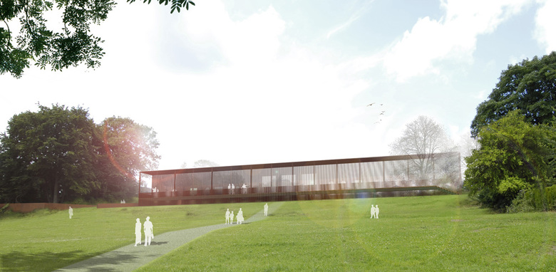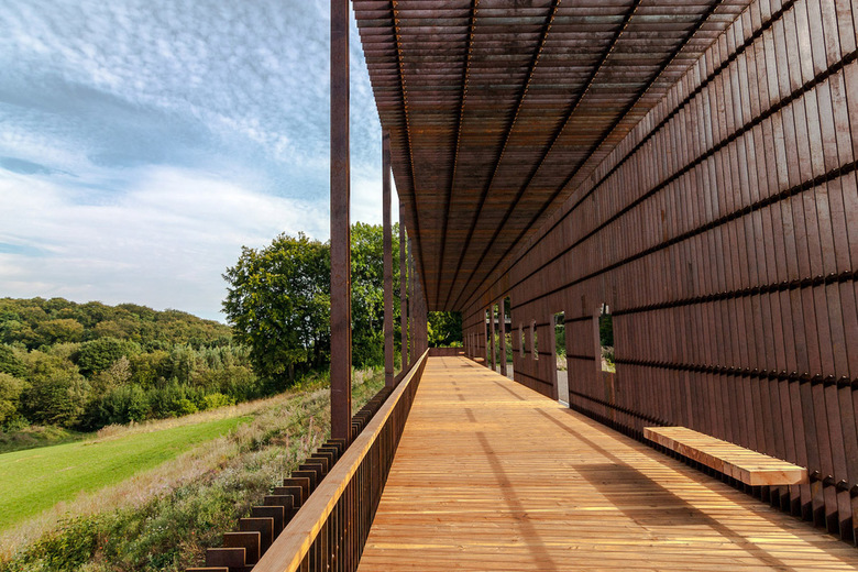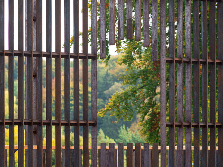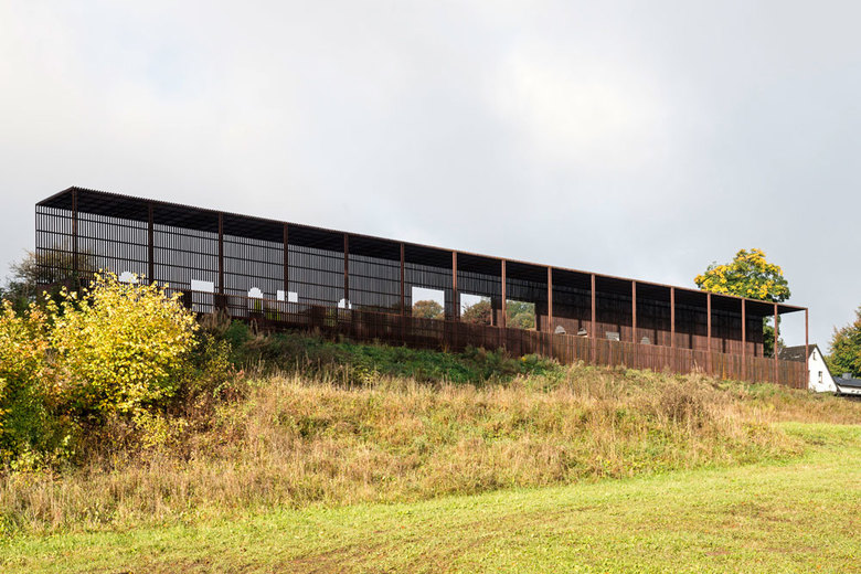 Durch eine transparente Konstruktion aus vorgefertigten CorTen-Stahllamellen ergeben sich Verweilqualitäten, Informationsmöglichkeiten und insbesondere ein landschaftliche Raumerlebnis der besonderen Art. Die primäre Tragkonstruktion des Stahlbaus besteht aus einer biegesteifen Rahmenkonstruktion im Bereich der Stützen zwischen denen Vollstahlprofile spannen, auf die die Lamellen aufgefädelt und verschweißt wurden. Es wurde sich einem wetterfesten Baustahl (COR-TEN B) bedient, der unbehandelt der natürlichen Bewitterung ausgesetzt wird, wodurch eine oberflächliche Abrostung zugelassen wird, die eine Sperrschicht bildet und das Material vor einer fortschreitenden Korrosion schützt. Die Mauern der ehemaligen Gebäude des Gutshofes werden durch Linien sichtbar, die Grundrissflächen aufgefüllt, so dass sich die Dimensionen der Räume und die Raumabfolgen deutlich abzeichnen. Über eine einfache, unprätentiöse Wegeführung, die am Hauptzugang an der Mittelachse im Nord-Osten beginnt, wird der Besucher über das Gelände zu den Standorten der ehemaligen Gebäude geführt. Dort sind auf Tafeln die wesentlichen Informationen aufgeführt.
