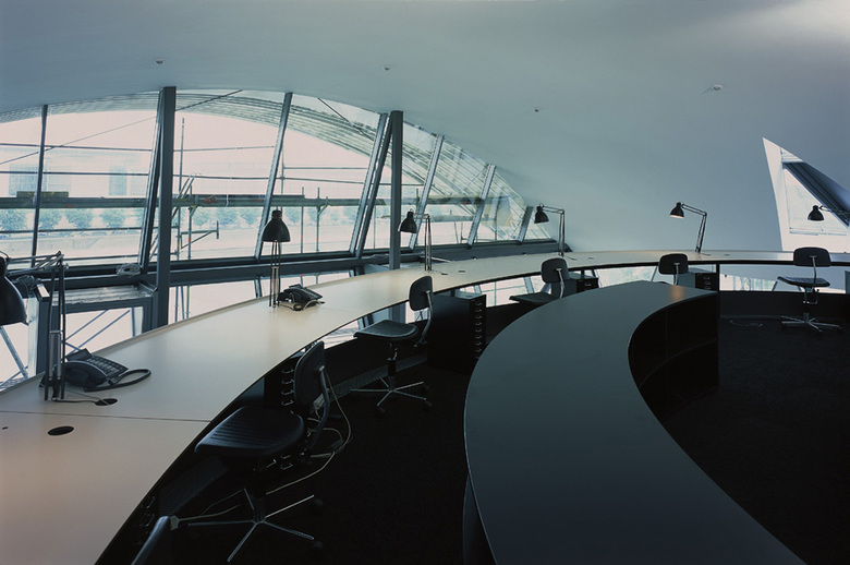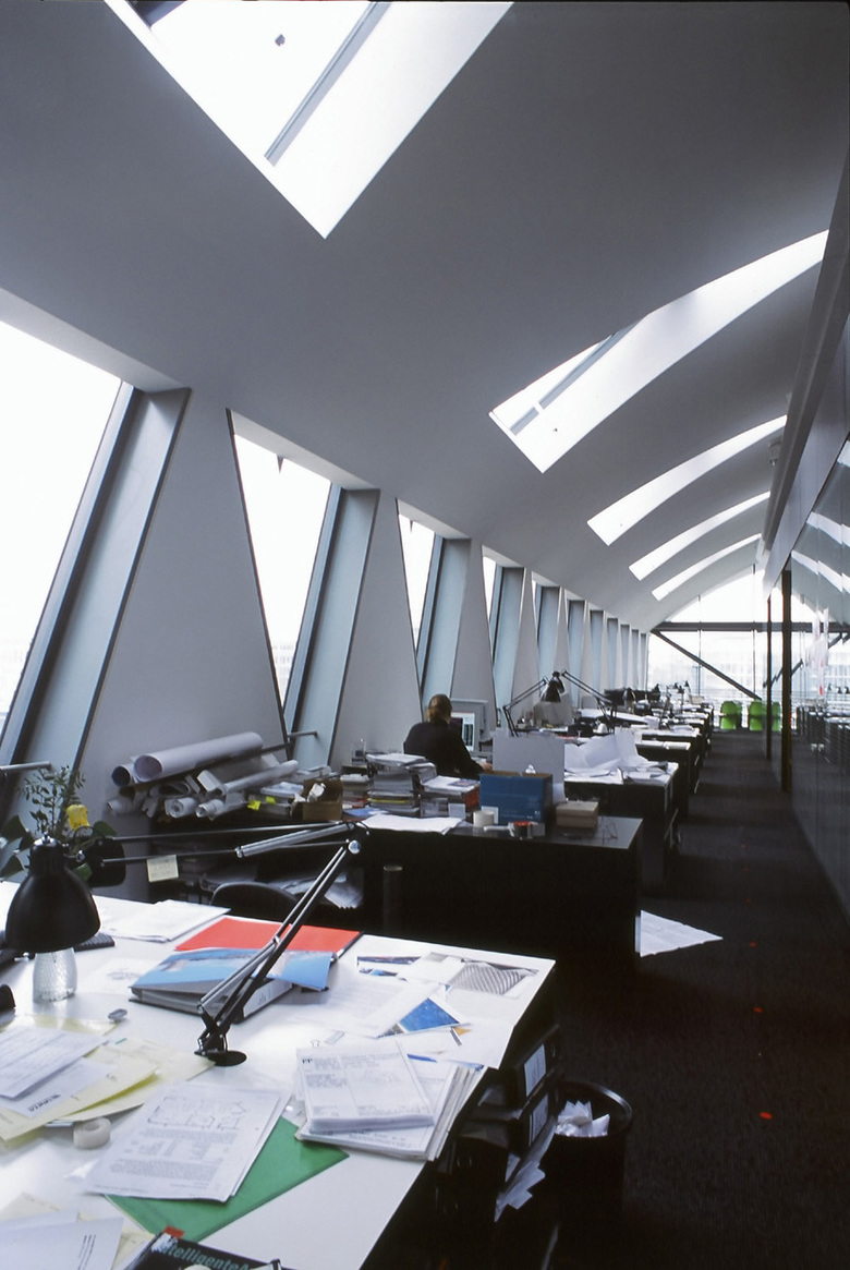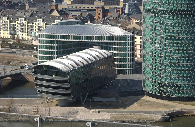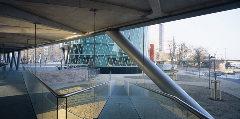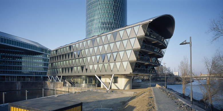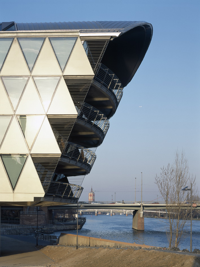 Das Gebäude ist Teil eines Gebäudeensembles, das den Übergang vom grünen Flussufer als Verlängerung des sogenannten Nizza zum steinernen Westhafenareal bilden soll. Der zylinderförmige TOWER dient als weithin sichtbare Dominante wohingegen das Brückengebäude des Ende des Grünzuges markiert und den Beginn des Hafenareals andeutet. Das Gebäude steht parallel zur Friedensbrücke und damit quer zum Hafenbecken. Es schiebt sich über die östliche Hafenmauer und nimmt damit den Geländeversprung von 2.25 m der alten Hafenmauer auf. In dieser Position ist es von der Gutleutstraße gut sichtbar und bildet über die Schleusenstrasse einen Bezug vom Gutleutviertel zum Main. Um das Hafenbecken städtebaulich eindeutig zu begrenzen, ohne es abzuschotten, ist das Gebäude aufgeständert. So bleibt der Bezug zwischen Hafenbecken und Nizza für den Fußgänger und Radfahrer erhalten.