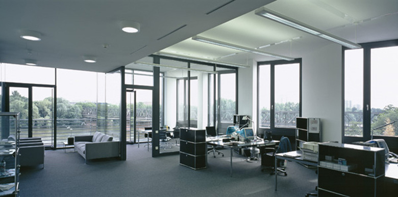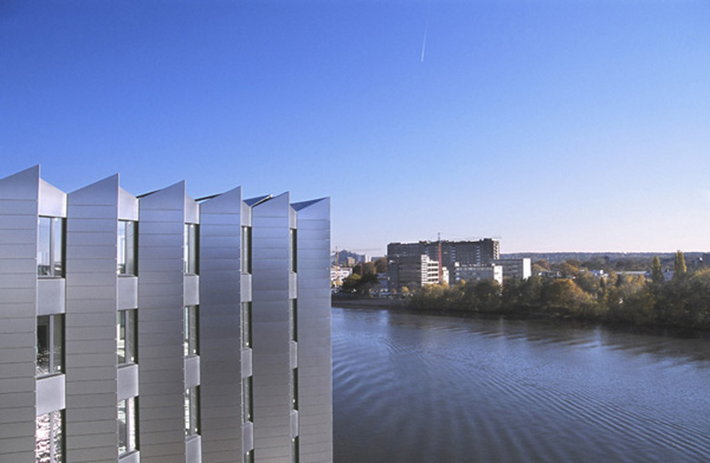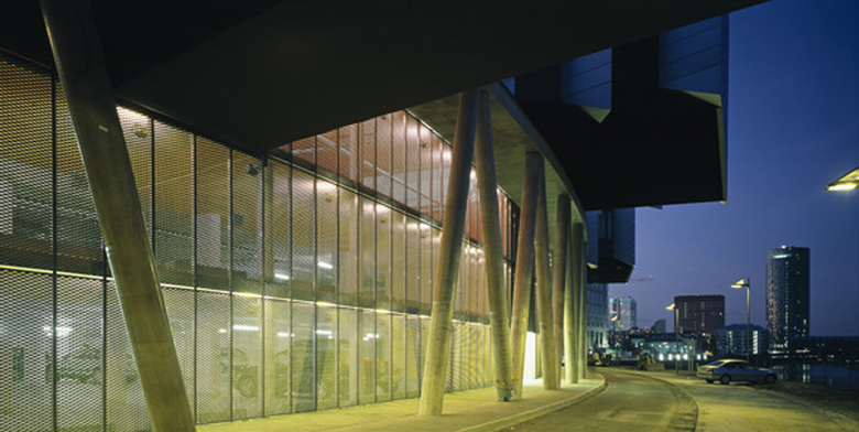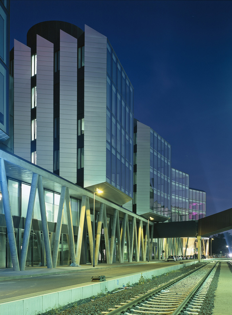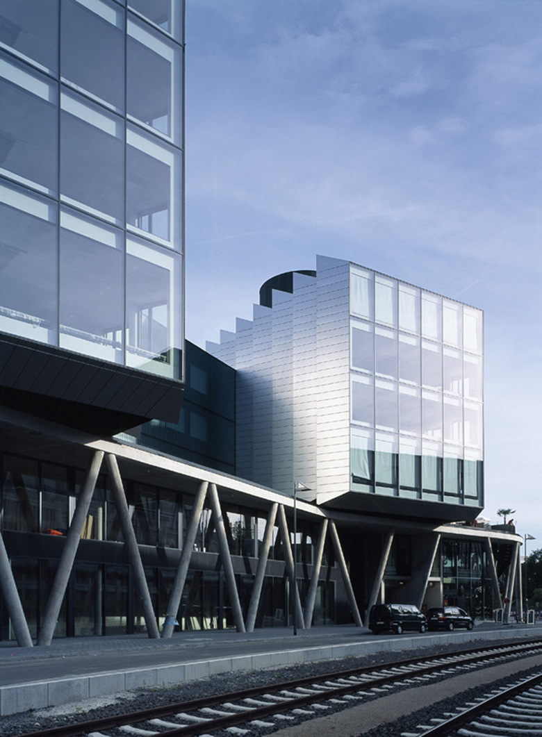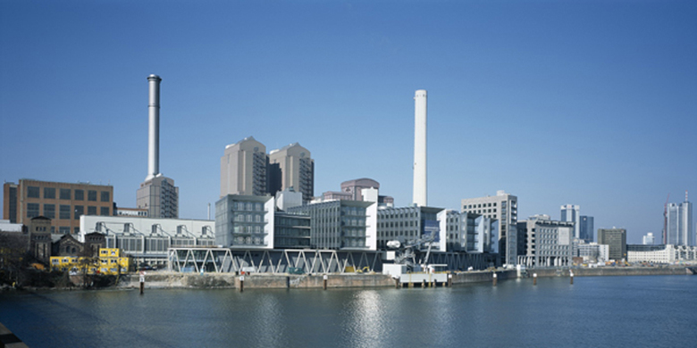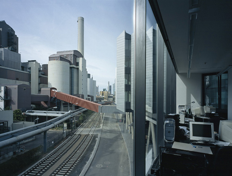 Die Antwort auf die komplexen Anforderungen ist ein knapp neun Meter hoher, dem Verlauf des Grundstücks folgender Sockel, auf dessen drei Geschossen Parkplätze ausgewiesen werden. Entwurfsprägend sind die umlaufenden 400m langen Arkaden, dessen Tragstruktur aus V- förmigen Stahlbetonstützen besteht. Der Stahlbetonkanal für die Aufnahme des Förderbandes der Kohleanlieferung wird in diesen Baukörper integriert. An den westlichen und nördlichen Enden des Sockels sind Flächen für ein Café, Ausstellungsräume und Büros vorgesehen. Darüber erhebt sich eine fächerartige Struktur aus fünf 4-geschossigen Büroriegeln mit Verbindungsbauten. Die schuppenartigen Fassaden erinnern hier in ihrer Form an einen Kamerabalg. Die geschlossenen Flächen werden mit Metallblechen verkleidet, offene bestehen aus geschosshoch verglasten Fensterelementen. Die Materialien und ihre Oberflächen nehmen den rauen Duktus der Umgebung auf, wirken aber wegen ihrer Bearbeitung und Detaillierung feiner und eleganter.