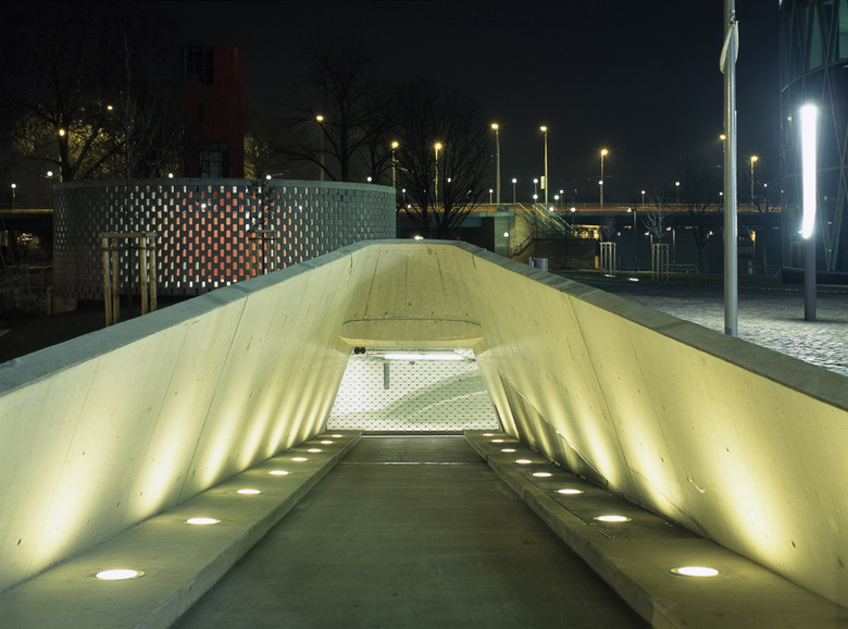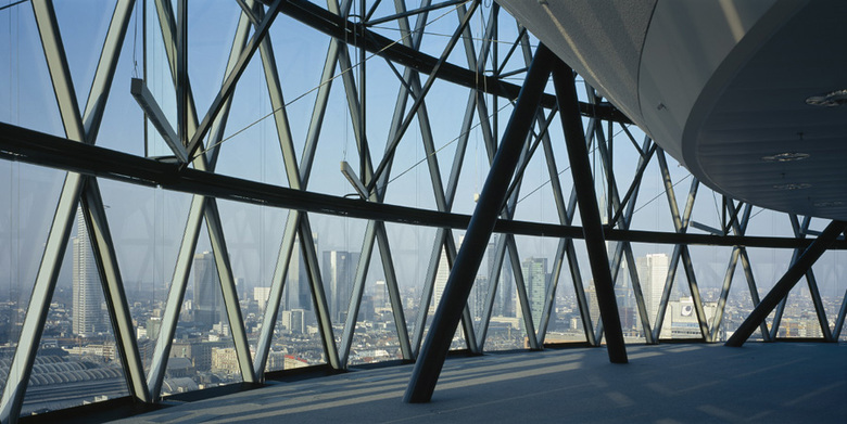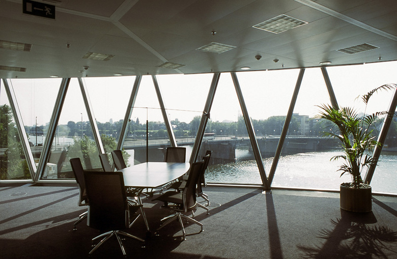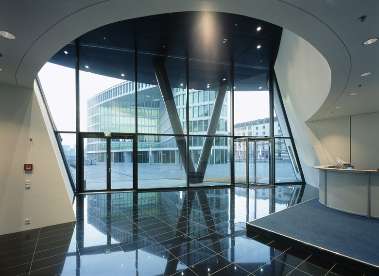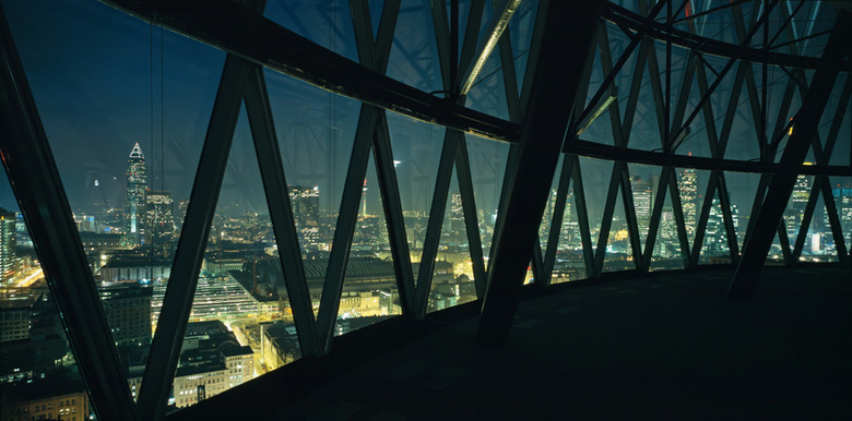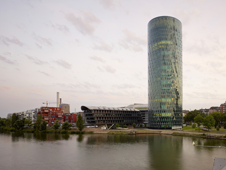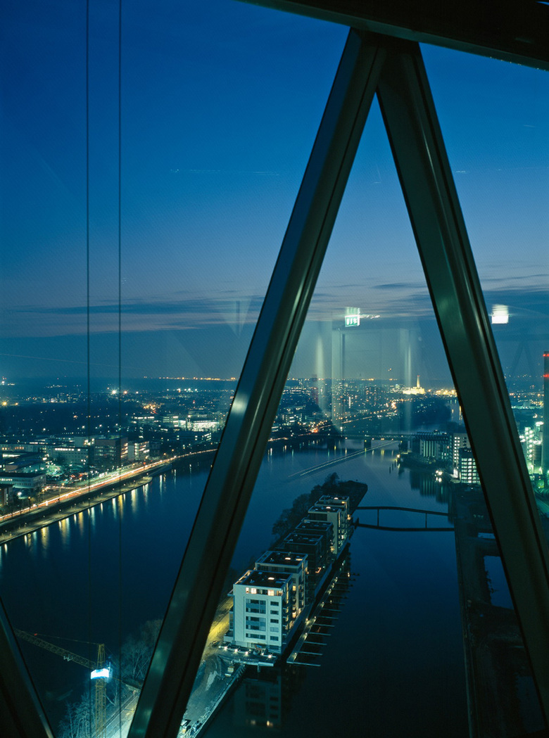 „Die Quadratur des Kreises“ – In seinem Aufbau gleicht der WESTHAFEN TOWER übereinander gestapelten, nahezu quadratischen Elementen, die innerhalb der zylindrischen Außenfassade durch ein einfaches Schichtungsprinzip zwei wichtige bautechnische Bedingungen optimieren: Die kreisförmige Grundfläche der Außenfassade nutzt optimal den Raum und minimiert dabei die Fassadenfläche, während die quadratischen Geschosse selbst optimal strukturierbar sind. Die Überlagerung von Kreis und Quadrat lässt Lufträume entstehen, welche sich entsprechend der geschossweisen Rotation um jeweils 90° zu 4-geschossigen „Wintergärten“ addieren.