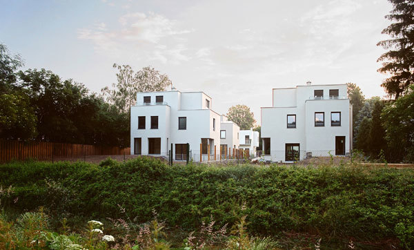 Wohnhausanlage an der westlichen Wiener Stadtgrenze, bestehend aus zwei Doppelhäusern und vier Einzelhäusern. Vielfalt in der Einheit, die Räume der Häuser sind nach Himmelsrichtungen und Ausblicken organisiert, die Farben der Häuser leicht abgestuft, Rankstäbe und Glitterblättchen betonen unterschiedliche Fassadenseiten. Geländer, Stiegen, Stufen und Fensterbänke sind gestalterisch herausgearbeitet.