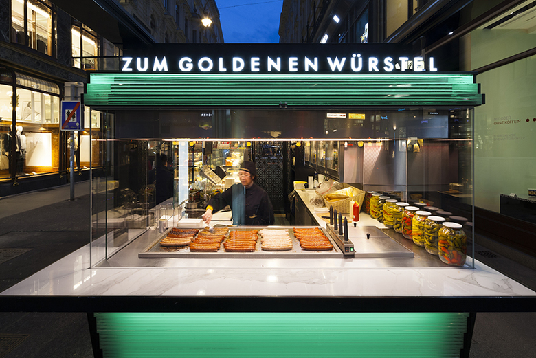 Als Inspiration diente das von Carlo Scarpa entworfene Tickethäuschen am Eingang der Giardini in Venedig. Rahmen in unterschiedlichen Materialien laufen in Mäandern um den Stand. Die Materialien und deren Kontraste sind an den Nachbarfassaden angelehnt: glänzendes und mattes goldenes Edelstahlblech, schwarzer Stahl, weißer Marmor, grünliche Glasschichten. Und dazu die klassischen Würstel.