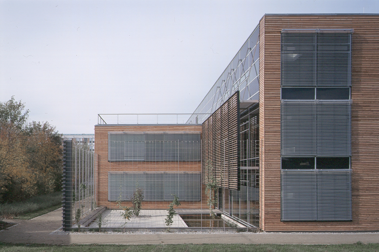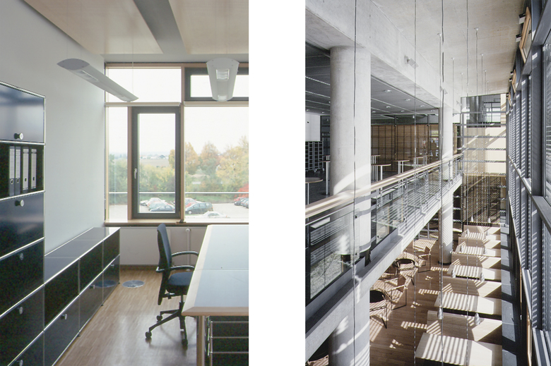 Die Gebäudekonfiguration antwortet auf den winkelförmigen Grundstückszuschnitt. Auch bei einer möglichen Erweiterung bleibt der Landschaftsverbrauch gering und der Zusammenhang der Freiflächen gewahrt. Die topographische Besonderheit - das Faiminger Tälchen - bleibt als großzügiger Grünraum erhalten. Die Aufständerung des Wohnflügels unterstützt dieses Freiraumkonzept. Die klare Baukörperausformung entspricht der inneren Organisation. Durch eine eindeutige Zonierung ist eine gute Orientierung gewährleistet. Die kompakte Bauweise mit bis zu sechs Geschossen minimiert die versiegelte Fläche und ermöglicht eine wirtschaftliche Realisierung. Im nordöstlichen Grundstücksteil wird der dreigeschossige Schulungstrakt mit Innenhöfen und Verwaltung angeordnet. Eine großzügige, über dreigeschossige Lufträume verknüpfte Erschließungszone dient dem kommunikativen Austausch.