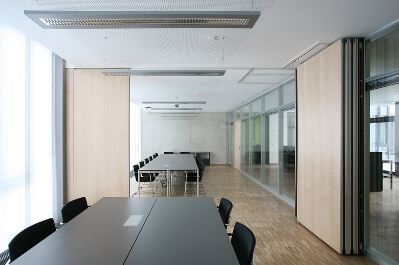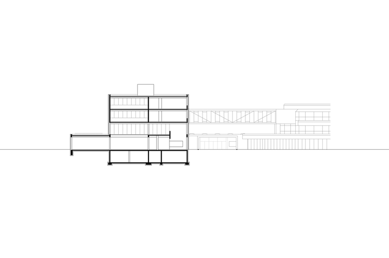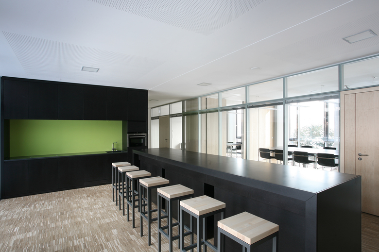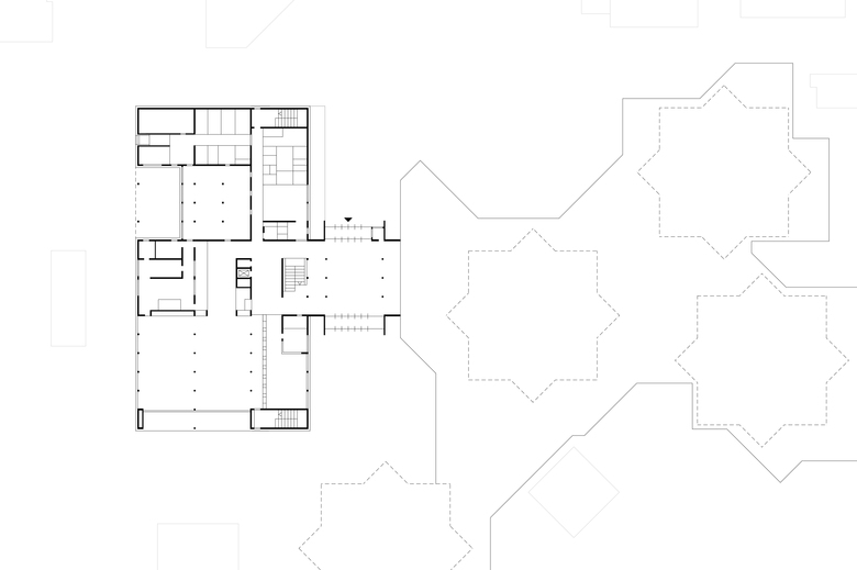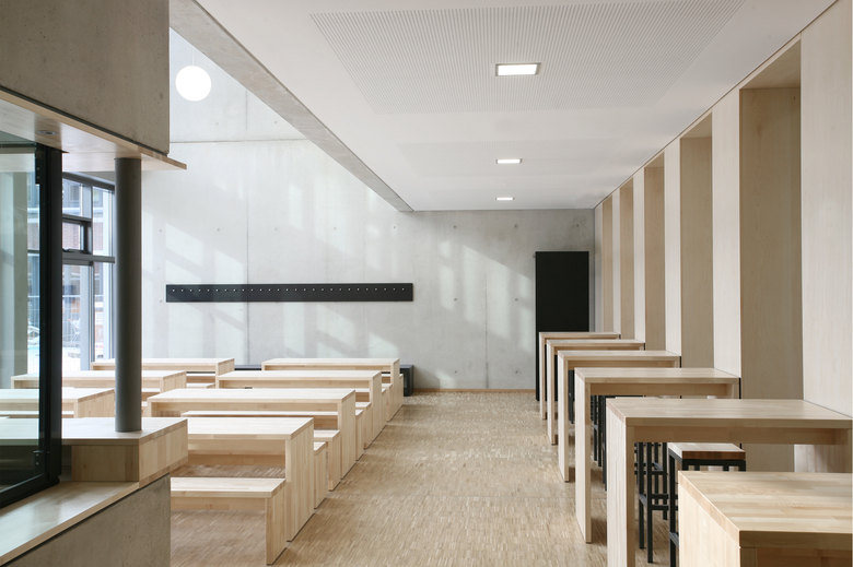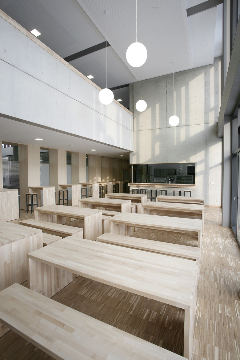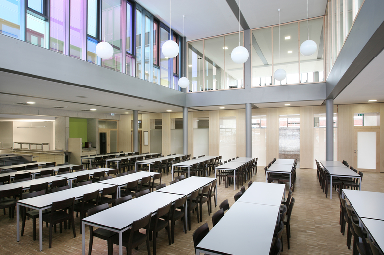 Der städtebaulichen Logik entsprechend wird die gesamte Fläche des Erdgeschosses für eine kompakte, wirtschaftliche Organisation der Küche mit Anlieferung und Lagerflächen und der Mensa genutzt. Das Fugengeschoß im 1. OG wird sinnfällig als Verwaltungs- und Galerie genutzt. Die Galerie wird durch großzügige Lufträume mit Mensa und Cafeteria verknüpft. Eine attraktive Terrasse im 1. OG stellt auch für den Galeriebereich attraktive Außenraumbezüge her. Die Verwaltung liegt vom Schulbetrieb ungestört und erfährt seine Qualität durch eine großzügige Verglasung und die Zuordnung von Freiflächen.