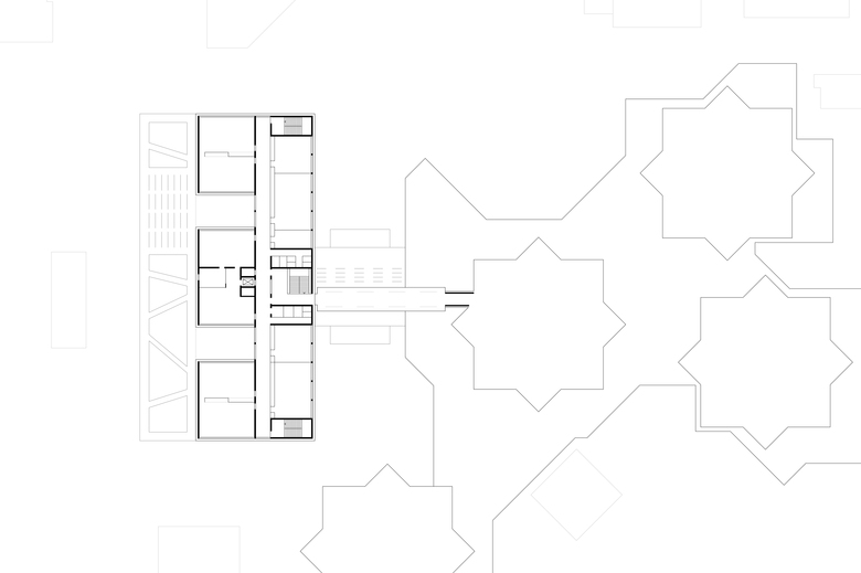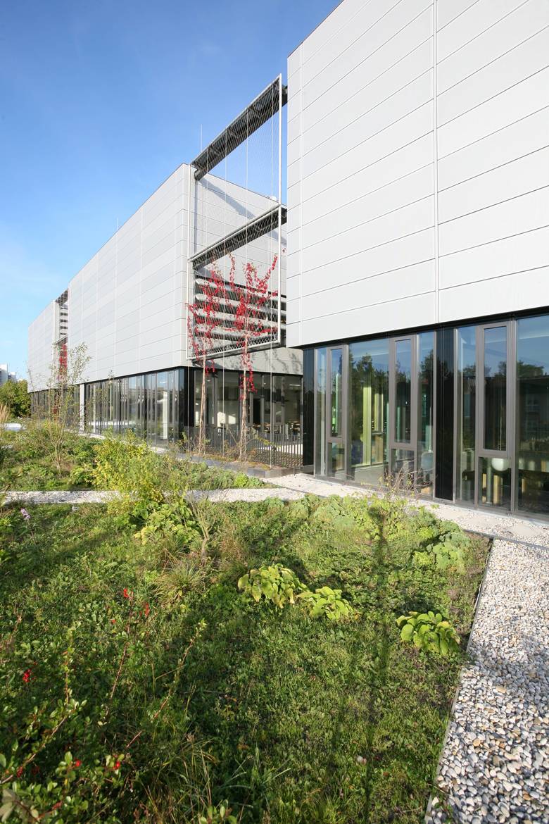 Das bestehende Schulzentrum der Europäischen Schule wird um einen neuen Baustein erweitert. An der Verbindungsstelle zum Bestand entsteht der neue Haupteingang. Der neue Baukörper stellt durch die Gliederung in Sockel und differenzierte Baukörper in den Obergeschossen Bezüge zum Bestand her. In Verbindung mit der Höhenstaffelung wird so eine maßstäbliche Baumasse zur Wohnbebauung geschaffen. Das Sockelgeschoss bietet lediglich für die Küchenver- und entsorgung eine entsprechende Öffnung. Eine intensive Begrünung auf dem Sockelgeschoß bietet ergänzend attraktive Freiraumbezüge für die Obergeschosse.
